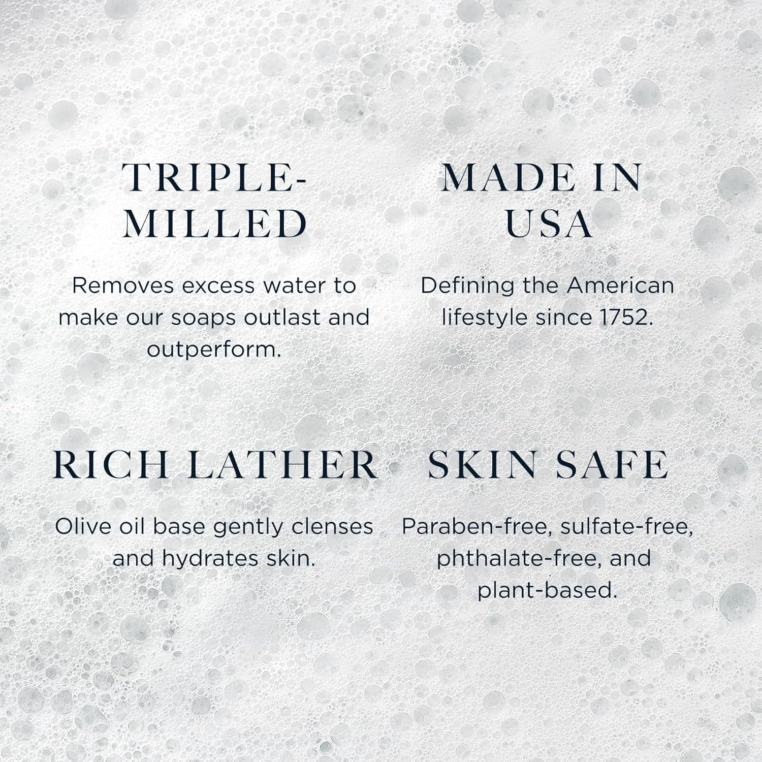 About this item Timeless American Fragrance: Inspired by our Number Six cologne originally formulated in 1772 (a favorite of George Washington), this surprisingly contemporary fragrance has notes of citrus, rose, clove, and amber. Triple-Milled Luxury Bath Soap: Upgrade your shower routine with these moisturizing soaps that are triple-milled for long-lasting performance. They are glycerin-rich to lock in moisture, leaving your skin soft and hydrated after each use. The Perfect Giftable Soap Set: This natural soap set comes in a three-pack and is a great gift for a birthday, holiday, or any other occasion. Enjoy its rich lather on the face, body and as a luxury hand soap. Plant-Based & Cruelty-Free: Our bar soaps are plant-based, cruelty-free, paraben-free, sulfate-free and phthalate-free. All Caswell-Massey products are made in the USA. Free of unnecessary and harmful ingredients, and always mindfully formulated. American-Made Artisan Soap Since 1752: Caswell-Massey specializes in fine fragrances, luxury soaps, and men’s & women’s grooming & skincare. Since our founding in 1752, the brand has defined the American lifestyle. › See more product details,Timeless American Fragrance: Inspired by our Number Six cologne originally formulated in 1772 (a favorite of George Washington), this surprisingly contemporary fragrance has notes of citrus, rose, clove, and amber,Triple-Milled Luxury Bath Soap: Upgrade your shower routine with these moisturizing soaps that are triple-milled for long-lasting performance. They are glycerin-rich to lock in moisture, leaving your skin soft and hydrated after each use,The Perfect Giftable Soap Set: This natural soap set comes in a three-pack and is a great gift for a birthday, holiday, or any other occasion. Enjoy its rich lather on the face, body and as a luxury hand soap,Plant-Based & Cruelty-Free: Our bar soaps are plant-based, cruelty-free, paraben-free, sulfate-free and phthalate-free. All Caswell-Massey products are made in the USA. Free of unnecessary and harmful ingredients, and always mindfully formulated,American-Made Artisan Soap Since 1752: Caswell-Massey specializes in fine fragrances, luxury soaps, and men’s & women’s grooming & skincare. Since our founding in 1752, the brand has defined the American lifestyle