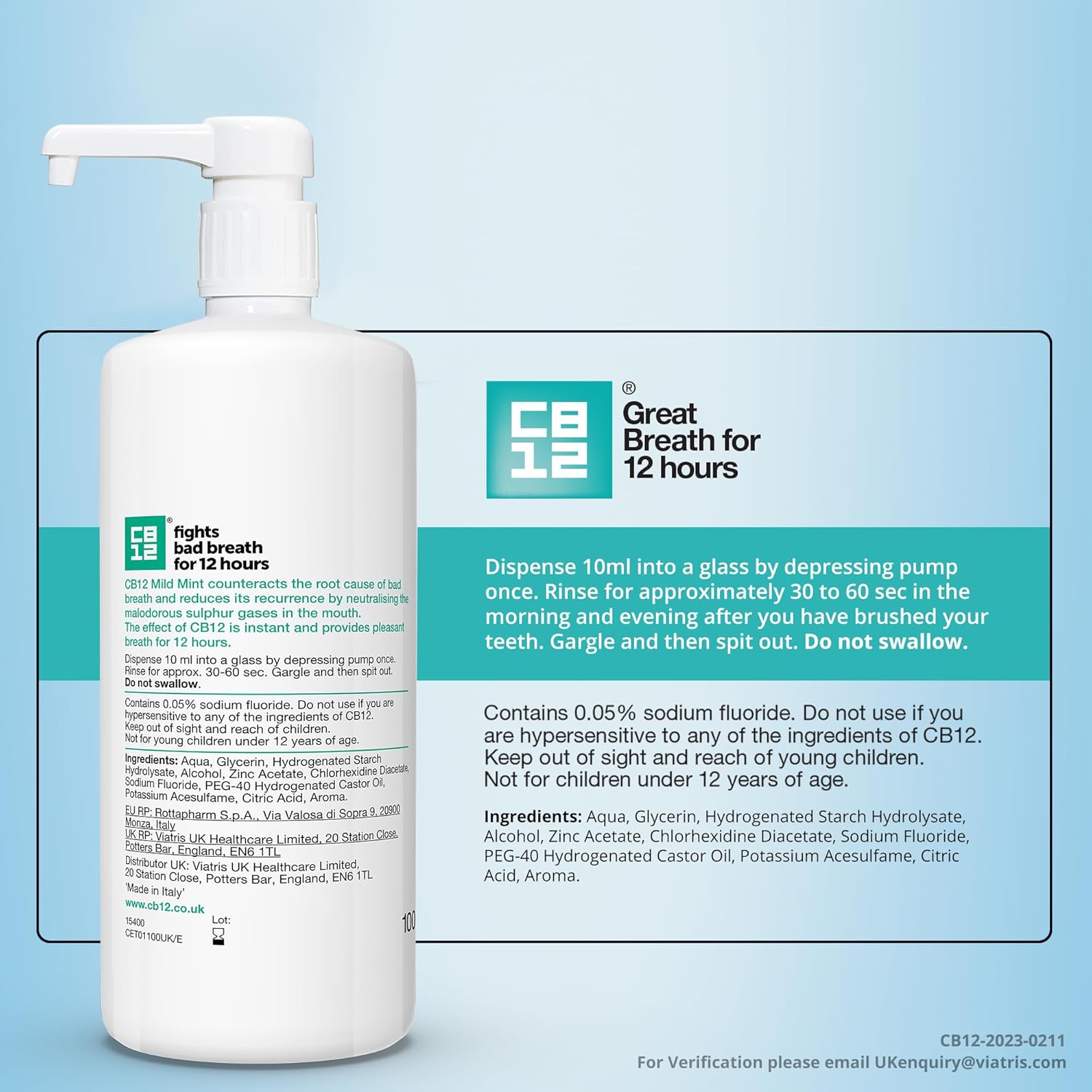 Ingredients Aqua, Glycerin, Hydrogenated Starch Hydrolysate, Alcohol, Zinc Acetate Dihydrate, Chlorhexidine Diacetate, Sodium Fluoride, PEG 40 Hydrogenated Castor Oil, Potassium Acesulfame, Propylene Glycol, Citric Acid, Aroma Directions Dispense 10ml into a glass by depressing the pump once. Rinse for approximately 30 to 60 seconds. Gargle and then spit out. P.when('A').execute(function(A) { A.on('a:expander:toggle_description:toggle:collapse', function(data) { window.scroll(0, data.expander.$expander[0].offsetTop-100); }); }); Safety Warning Keep out of reach of children. Not for children under 12 years of age. See more,The information below applies to each unit in the pack,CB12 Mild Mint Mouthwash eliminates bad breath and prevents its reoccurrence by neutralizing the malodorous sulphur gases in your mouth. The effect of CB12 is instant and provides odour-free breath for 12 hours,CB12 Mild Mint contains 0.05% sodium fluoride, an ingredient proven to strengthen your enamel with daily use,Use as required, for a 24-hour effect, rinse morning and evening,CB12 Mouthwash is recommended for daily use from the age of 12,Always check the product packaging before use