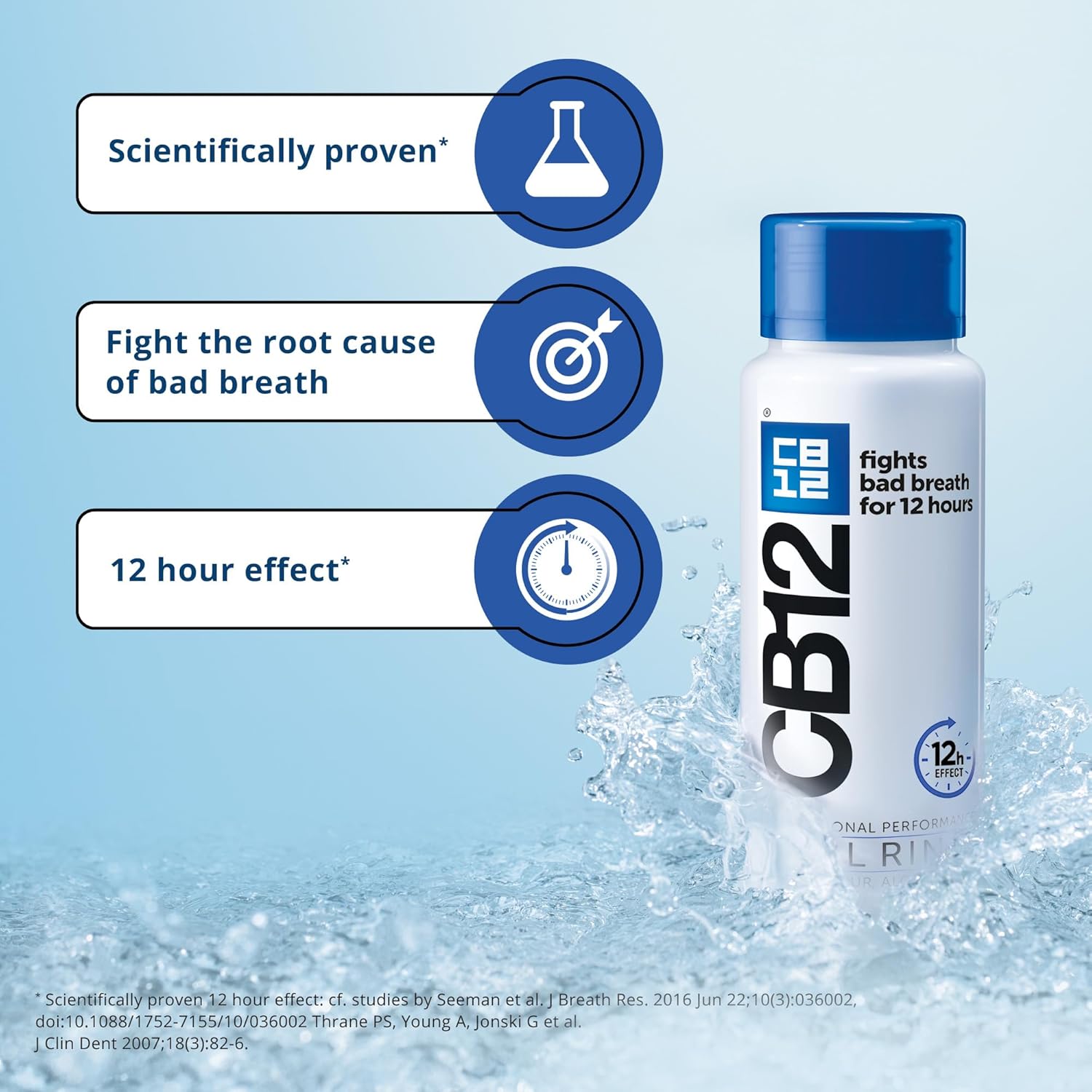 About this item CB12 Mint Mouthwash counteracts the root cause of bad breath and prevents its reoccurrence by neutralizing the malodorous sulphur gases in your mouth. The effect of CB12 is instant and provides pleasant breath for 12 hours. An alcohol-free mouthwash with a pleasant, soft Mint flavour. CB12 Mint contains 0.05% sodium fluoride, an ingredient proven to strengthen your enamel with daily use. Use as required, for a 24-hour effect, rinse morning and evening. CB12 Mouthwash is recommended for daily use from the age of 12. Always check the product packaging before use. › See more product details,CB12 Mint Mouthwash counteracts the root cause of bad breath and prevents its reoccurrence by neutralizing the malodorous sulphur gases in your mouth. The effect of CB12 is instant and provides pleasant breath for 12 hours,An alcohol-free mouthwash with a pleasant, soft Mint flavour,CB12 Mint contains 0.05% sodium fluoride, an ingredient proven to strengthen your enamel with daily use,Use as required, for a 24-hour effect, rinse morning and evening,CB12 Mouthwash is recommended for daily use from the age of 12,Always check the product packaging before use