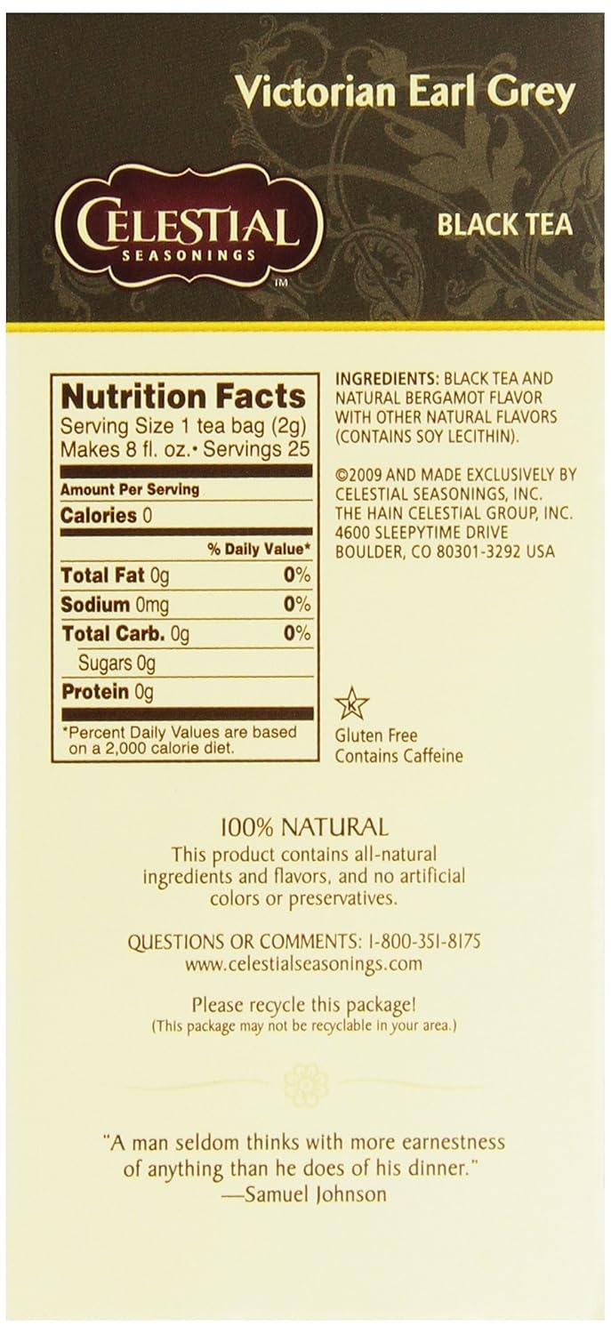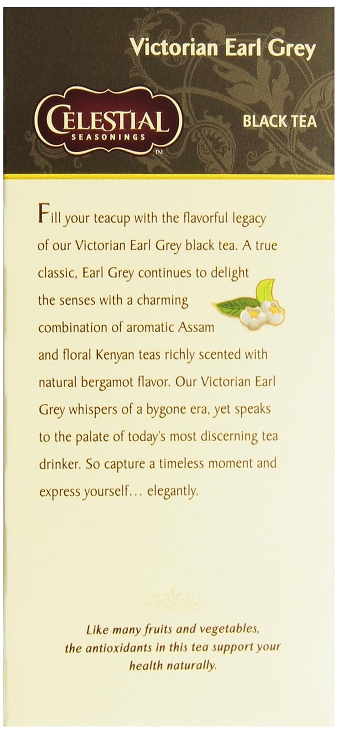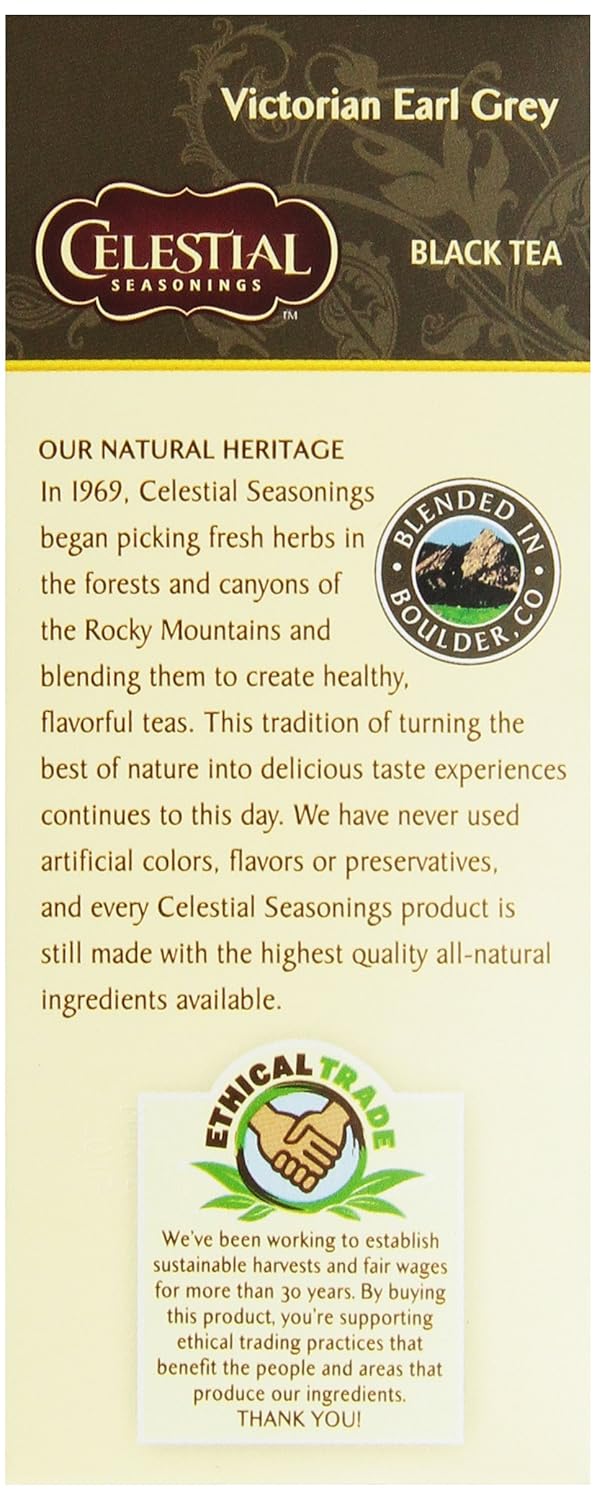 Celestial Seasonings Victorian Earl Grey Tea Is The Perfect Way To Jumpstart Your Morning. Our Black Tea Is Infused With Bergamot For A Citrusy, Slightly Herbal Taste. We Achieve This Flavor Profile Without The Use Of Any Artificial Flavors, Colors, Artificial Preservatives Or Gluten. To Reduce Excess Waste, Our Tea Bags Are Stringless And Come Packaged In Recycled Boxes. Simply Steep A Black Tea Bag In Hot Water For 4-6 Minutes For The Perfect Cup. Includes Six 25-Count Boxes Of Celestial Seasonings Victorian Earl Grey Tea. Celestial Seasonings Teas Are An Invitation To Bring The Perfect Balance To Your Day. From Herbal Teas To Chai And Matcha Lattes And Everything In Between, ThereāS A Celestial Blend ThatāS Just Right For Any Occasion. We Blend Our Teas Using The Finest Herbs, Teas, Spices And Botanicals Available, And We Lovingly Package Them In Engaging, Thoughtful Boxes That Truly Represent The Goodness Found Inside