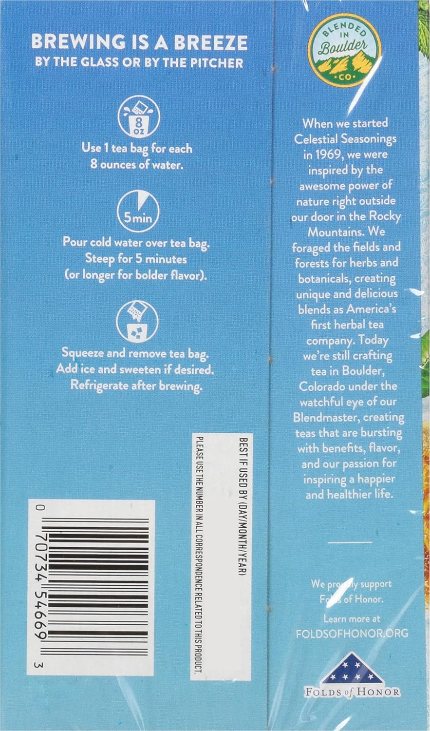 Lively Notes Of Lemongrass And Citrus Fruits Harmoniously Blend With Cool Mint To Make This Iced Green Tea Extra Smooth And Refreshing! Brew One Glass At A Time With Our Convenient Cold Water Steeping Method - No Boiling Required. When We Started Celestial Seasonings In 1969, We Were Inspired By The Awesome Power Of Nature Right Outside Our Door In The Rocky Mountains. We Foraged The Fields And Forests For Herbs And Botanicals, Creating Unique And Delicious Blends As AmericaāS First Herbal Tea Company. Today WeāRe Still Crafting Tea In Boulder, Colorado Under The Watchful Eye Of Our Blend Master, Creating Blends That Are Bursting With Benefits, Flavor And Our Passion For Inspiring A Happier And Healthier Life. We Proudly Support Folds Of Honor. Blending Herbs, Art, And Inspiration Since 1969