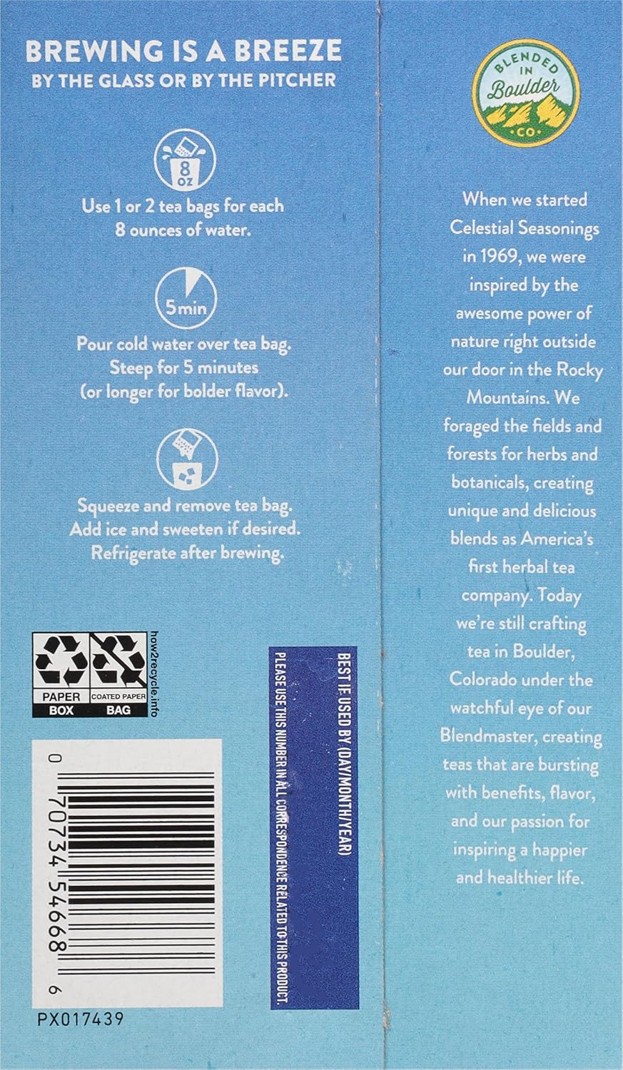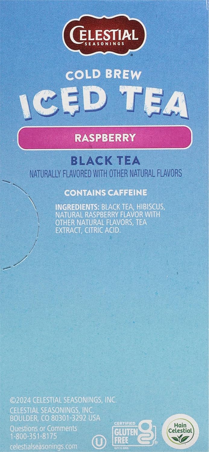 The Sweet, Yet Tart, Flavor Of Raspberries Make This Iced Tea Extra Refreshing! Brew One Glass At A Time With Our Convenient Cold Water Steeping Method - No Boiling Required. A Blend Of Bold, Smooth Black Tea And Tart, Juicy Raspberry Flavor Gives This Blend A Spirited Taste. When We Started Celestial Seasonings In 1969, We Were Inspired By The Awesome Power Of Nature Right Outside Our Door In The Rocky Mountains. We Foraged The Fields And Forests For Herbs And Botanicals, Creating Unique And Delicious Blends As AmericaāS First Herbal Tea Company. Today WeāRe Still Crafting Tea In Boulder, Colorado Under The Watchful Eye Of Our Blend Master, Creating Blends That Are Bursting With Benefits, Flavor And Our Passion For Inspiring A Happier And Healthier Life. We Proudly Support Folds Of Honor. Blending Herbs, Art And Inspiration Since 1969