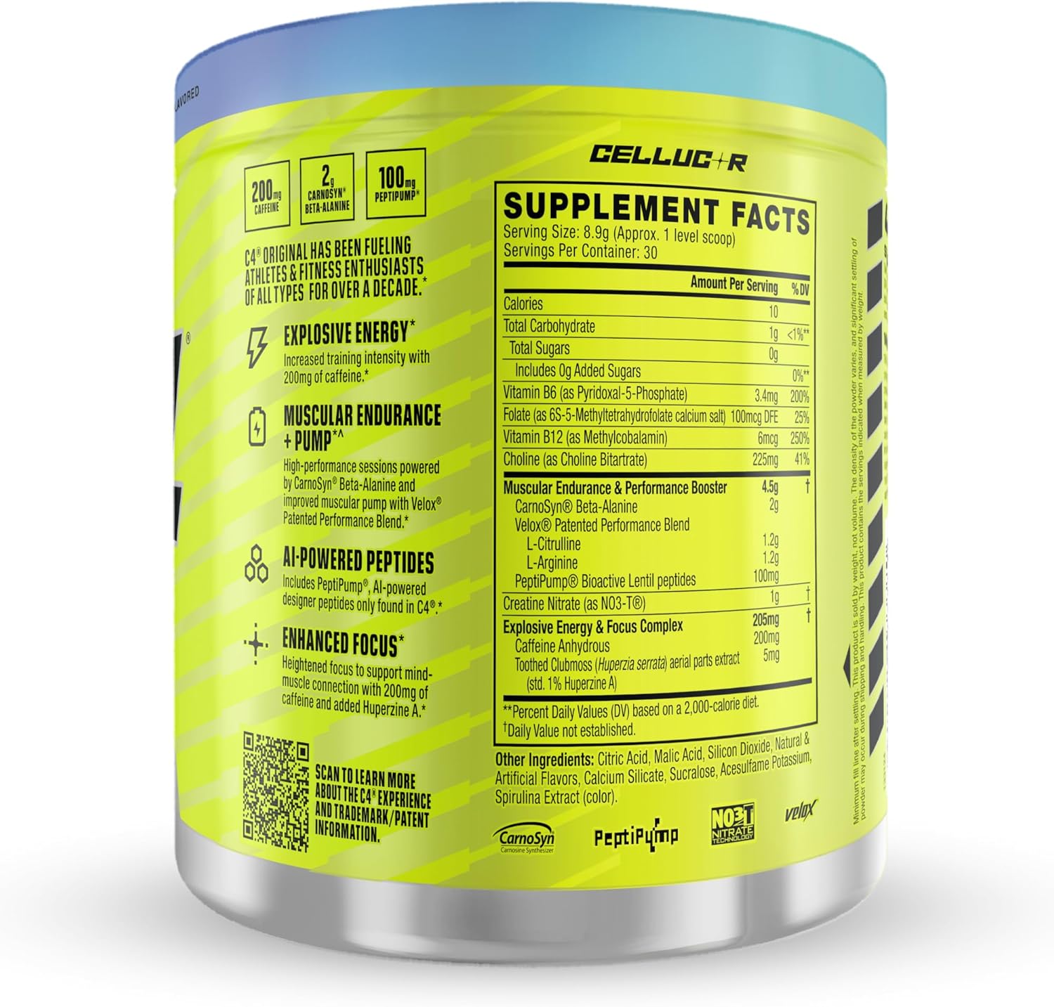 Ready to smash your goals and take your fitness to the next-level The new, enhanced C4 Original formula is your key to hitting every training session hard. We took our OG powerhouse blend to new heights, packing in 200mg of Caffeine for explosive energy that HITS and 2g of CarnoSyn® Beta-Alanine for enhanced muscular endurance designed to keep you powering through even the toughest sets. Next, our triple threat blend of L-Citrulline, L-Arginine, and Creatine Nitrate keeps the pumps and power coming with increased nitric oxide production support. With AI-powered PeptiPump®, exclusive to C4, for supporting increased performance, and enhanced focus from Huperzine A; the revamped C4 Original formula will keep you hitting every rep as hard as the first,HARD HITTING ENERGY: Make your gym sesh hit harder with 200mg of Caffeine for explosive energy,MUSCULAR ENDURANCE^: Conquer your toughest workouts with CarnoSyn Beta-Alanine for endurance support,AI-POWERED PEPTIDES: PeptiPump is an AI-powered designer peptide exclusively found in C4,ENHANCED FOCUS: Stay sharp & focused, from the first rep to the last, with the power of Huperzine A + Caffeine,INCREDIBLE FLAVOR: With billions of servings sold, the C4 brand has set the standard for great flavor for over a decade