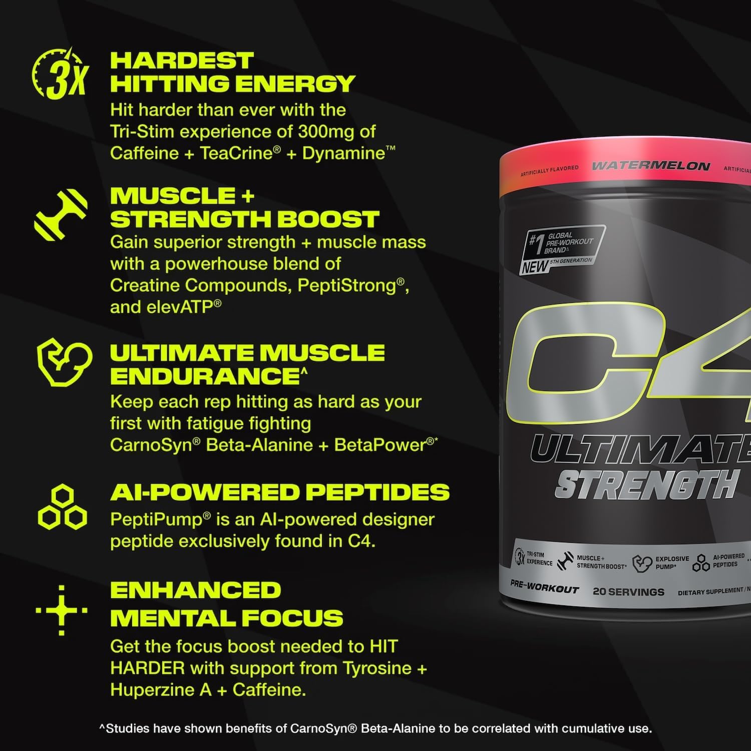 If you do Bulgarian Split Squats for fun at the end of leg day, this is the pre-workout for you. Introducing the Ultimate gain-changer: NEW C4 Ultimate Strength. Designed for those who thrive off the hardest-hitting workouts, our most robust blend features 300mg of Caffeine, TeaCrine®, and Dynamine™, for a tri-stim energy experience in combo with 3.2g of fatigue fighting CarnoSyn® Beta-Alanine + 1.25g of BetaPower ® that will give training to failure a whole new meaning. We turned up the volume on strength and muscle building with a powerhouse blend of 5.5g quality creatine compounds, 2.4g of AI-Powered PeptiStrong®, and 150mg of ElevATP® for increased strength, power and muscle mass. Next, we added 200mg of C4 Exclusive AI-powered peptide, PeptiPump® with a patented VELOX® blend of L-Citrulline, and L-Arginine for seriously satisfying pumps and performance. Step up your training with the new C4 Ultimate Strength pre-workout. ^Studies have shown benefits of CarnoSyn® Beta-Alanine to be correlated with cumulative use,HARDEST HITTING ENERGY: Hit harder than ever with the Tri-Stim experience of 300mg of Caffeine + TeaCrine + Dynamine,MUSCLE + STRENGTH BOOST: Gain superior strength + muscle mass with a powerhouse blend of Creatine Compounds, PeptiStrong, and elevATP,UNRIVALLED PUMPS: Made with VELOX: a patented mix of L-Arginine + L-Citrulline for seriously satisfying pumps & performance,ULTIMATE MUSCLE ENDURANCE^: Keep each rep hitting as hard as your first with fatigue fighting CarnoSyn Beta-Alanine + BetaPower,AI-POWERED PEPTIDES: PeptiPump and PeptiStrong are AI-powered designer peptides exclusively found in C4