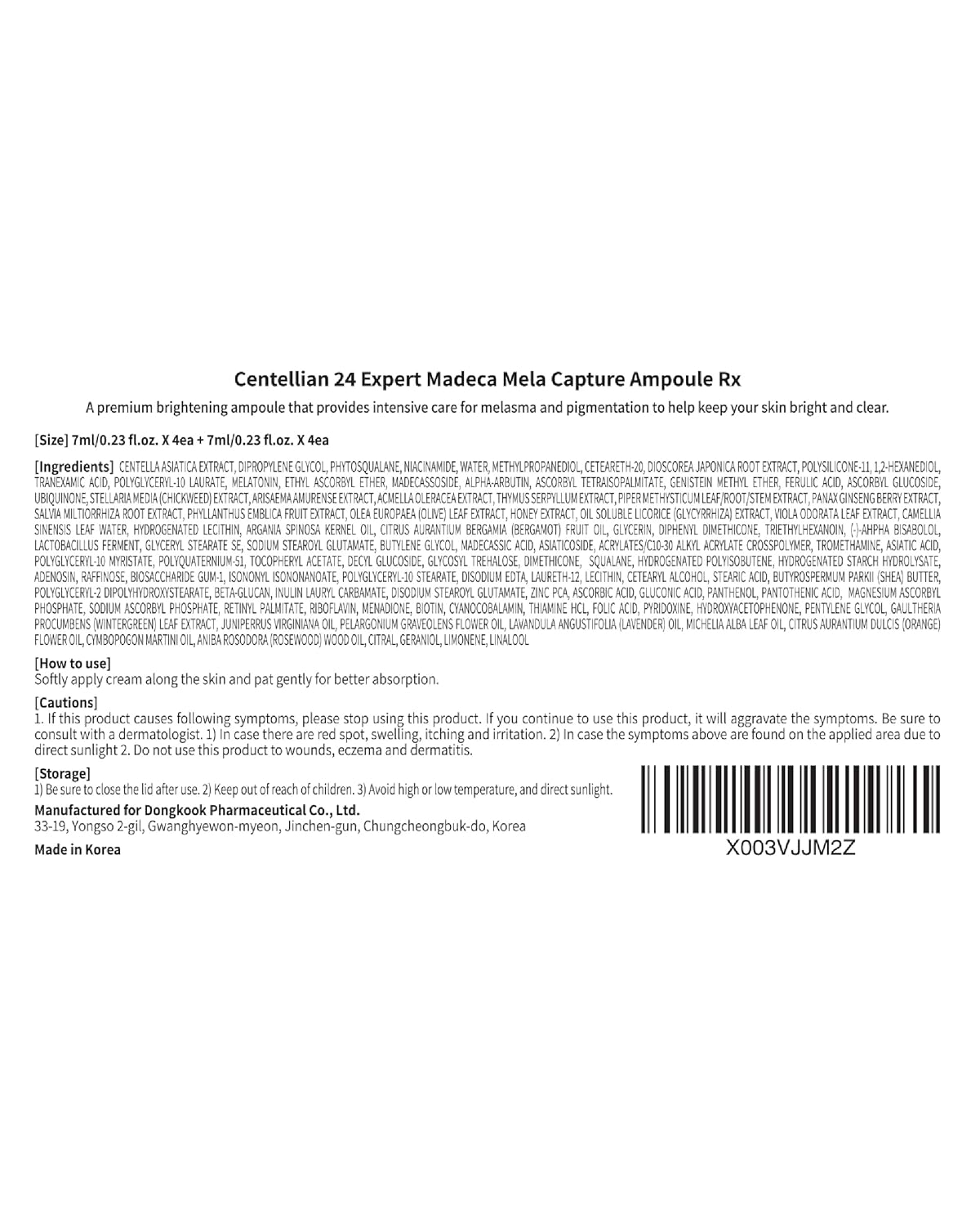 About this item CENTELLIAN 24 EXPERT MADECA CAPTURE AMPOULE (Season 1, 7ml/0.2fl oz x 8 pcs) is a potent premium solution that effectively diminishes even the most stubborn spots, freckles, and blemishes while promoting a brighter, more even complexion. You'll notice visible improvements in just 5 consecutive days of use. ULTRA-CONCENTRATED FORMULA - Every bottle contains a high-potency blemish-treating ampoule loaded with 10,000 ppm of TECA (titrated extract of centella asiatica), the foundational ingredient of Dongkook Pharmaceutical's technology, alongside 10,000 ppm of MadeWhite, a patented skin-illuminating ingredient. ENHANCED ELASTICITY - Expert Madeca Capture Ampoule boosts skin elasticity, leaving your skin feeling supple, firmer, and healthier with every application. CENTELLIAN 24 - Experience innovative, long-lasting skincare solutions by Centellian 24, a trusted derma-cosmetic brand, leveraging 50+ years of skin science technology from Dongkook Pharmaceutical. Our centella asiatica-based products repair and maintain your skin's health and youthfulness for 24 hours. DONGKOOK - A leading healthcare group from South Korea, Dongkook Pharmaceutical is renowned for over half a century of centella asiatica expertise. Famous for Medacasol, a household name in Korea, Dongkook now brings its healing prowess to skincare, offering innovative solutions for sensitive skin. › See more product details,CENTELLIAN 24 EXPERT MADECA CAPTURE AMPOULE (Season 1, 7ml/0.2fl oz x 8 pcs) is a potent premium solution that effectively diminishes even the most stubborn spots, freckles, and blemishes while promoting a brighter, more even complexion. You'll notice visible improvements in just 5 consecutive days of use,ULTRA-CONCENTRATED FORMULA - Every bottle contains a high-potency blemish-treating ampoule loaded with 10,000 ppm of TECA (titrated extract of centella asiatica), the foundational ingredient of Dongkook Pharmaceutical's technology, alongside 10,000 ppm of MadeWhite, a patented skin-illuminating ingredient,ENHANCED ELASTICITY - Expert Madeca Capture Ampoule boosts skin elasticity, leaving your skin feeling supple, firmer, and healthier with every application,CENTELLIAN 24 - Experience innovative, long-lasting skincare solutions by Centellian 24, a trusted derma-cosmetic brand, leveraging 50+ years of skin science technology from Dongkook Pharmaceutical. Our centella asiatica-based products repair and maintain your skin's health and youthfulness for 24 hours,DONGKOOK - A leading healthcare group from South Korea, Dongkook Pharmaceutical is renowned for over half a century of centella asiatica expertise. Famous for Medacasol, a household name in Korea, Dongkook now brings its healing prowess to skincare, offering innovative solutions for sensitive skin