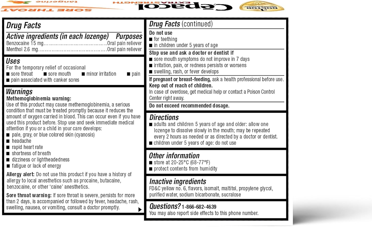 [CEPACOL EXTRA STRENGTH SORE THROAT RELIEF] Powerful, fast acting Honey Lemon flavored sore throat relief lozenge