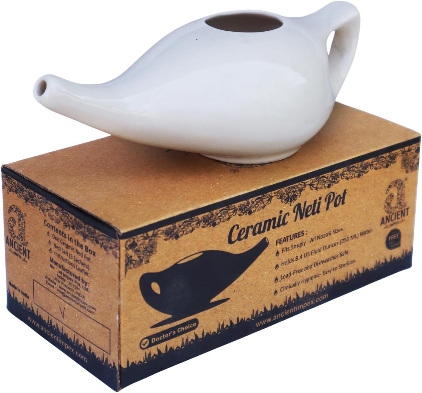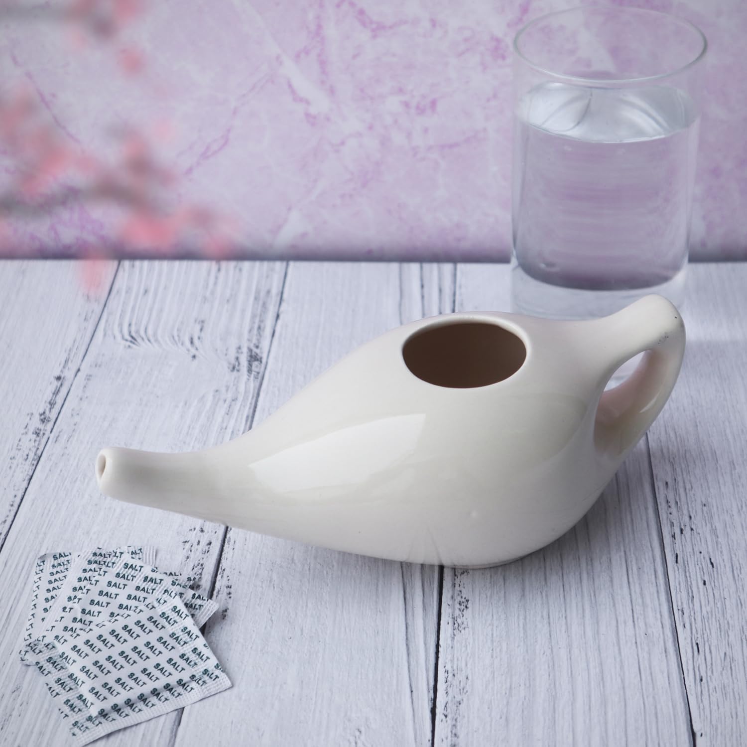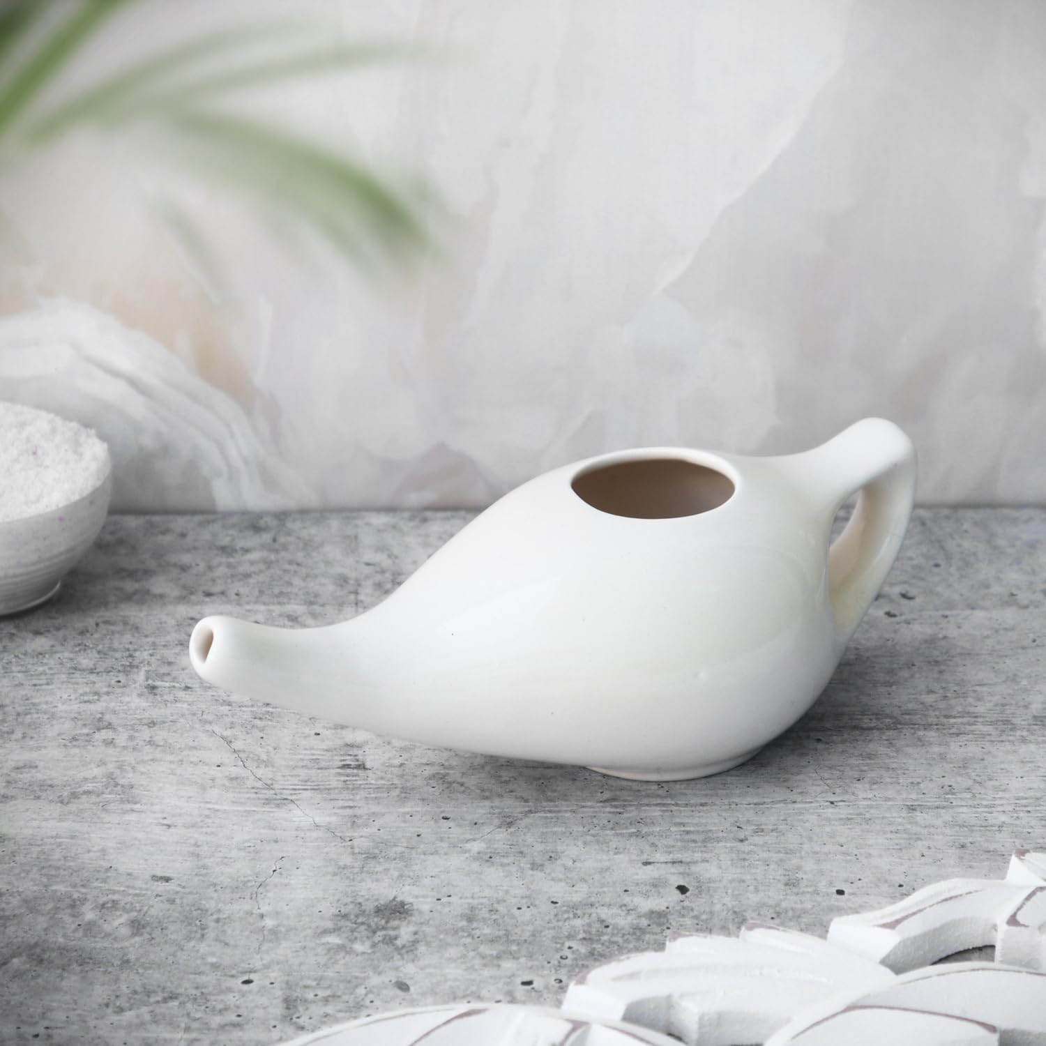 Ceramic Neti Pot 250 Ml Capacity (White) With 5 Sachets Neti Salt, A Natural Remedy For Nasal Irrigation