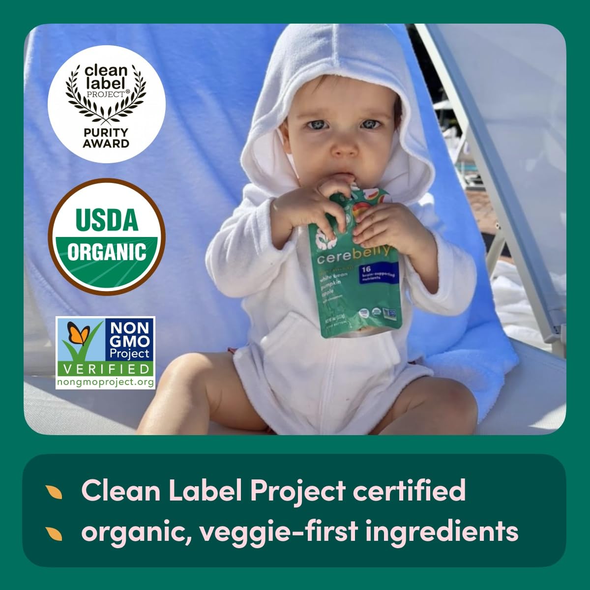 Supports Cognitive Development - Cerebelly Pouches Are The Only Organic Fruit Pouch (And Veggie Pouch) That Delivers 16 Key Brain-Supporting Nutrients Studied By Our Founder. A Downright Delicious Blend High In Iron, Copper, Folate, And Choline That Helps Your Little One’S Brain Manage Speech And Supports The Development Of Their Visual Processing. Other Veggie Pouches For Toddlers And Regular Baby Formula Lack The Quality Brain Nutrients We Know Your Growing Baby Needs!