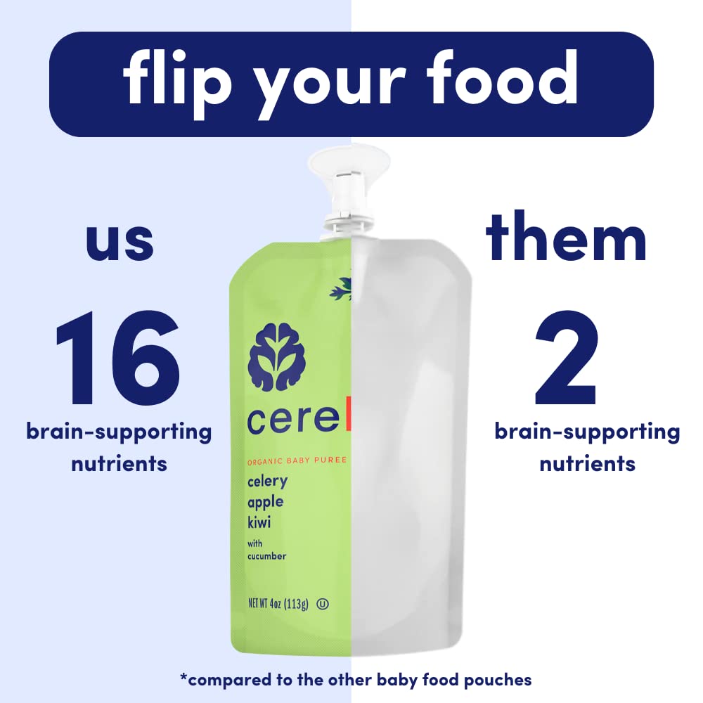 SMART FOOD AND SNACK FOR BABIES - Our Celery Apple Kiwi baby food pouches were created by a practicing neurosurgeon, Stanford PhD in developmental neurobiology and mom-of-three. After years of trial and error she developed the perfect baby squeeze pouches. With tasty ingredients and science-backed nutrition, our smoothie-inspired baby food puree pouches are the best baby snacks (and toddler foods) for your child’s growing brainSUPPORTS COGNITIVE DEVELOPMENT - Cerebelly baby fruit pouches are the only organic fruit pouch (and veggie pouch) that delivers 16 key brain-supporting nutrients studies by our founder, including Choline and Selenium that supports your little one’s frontal lobe and cingulum, regions that play a pivotal role in executive function and emotions. Other veggie and fruit pouches for toddlers and regular baby formula lack the quality brain nutrients we know your growing baby needsCLEAN LABEL AWARD SO PARENTS DON'T HAVE TO WORRY - Our toddler food pouches are Clean Label certified. This is a fruit pouch for kids that’s tested for harmful levels of heavy metals and toxins to make sure you are feeding your little one only the highest quality baby food purees. Other companies' toddler snacks and toddler meals may fall short of testing, but we’re the first shelf-stable baby food to receive the Clean Label Project Purity Award. We are raising the bar for organic baby food!ORGANIC INGREDIENTS - This isn’t like your average applesauce squeeze pouch! Baby food pouches stage 1, 2, 3 crafted from whole foods, including crunchy celery paired with sweet apples and kiwi! We’ve put a fresh spin on baby puree. Veggie-first and no added sugar, our organic fruit and vegetable pouches give your baby what their brain and body needs, right from the start, baby food meals perfect for every stage of development!