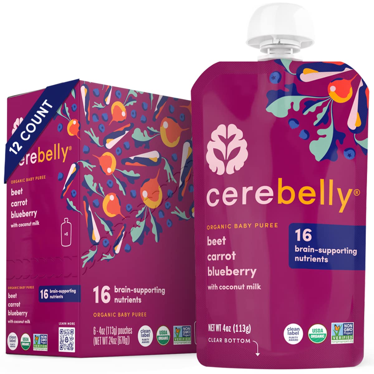 Cerebelly Baby Food Pouches – Organic Beet Carrot Blueberry (4 oz, Pack of 12) - Toddler Snacks, 16 Brain-supporting Nutrients, Healthy Snacks, Made with Gluten-Free Ingredients, No Added Sugar