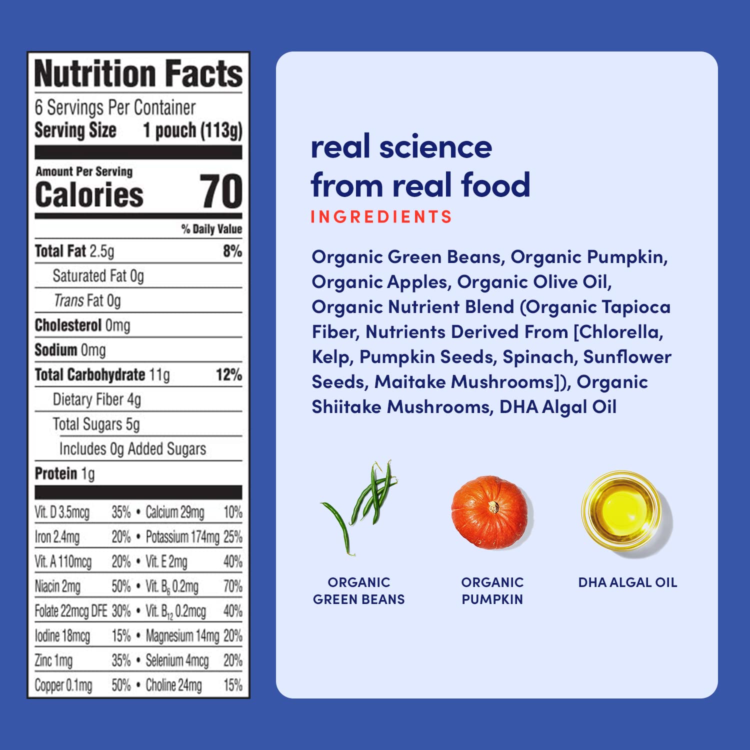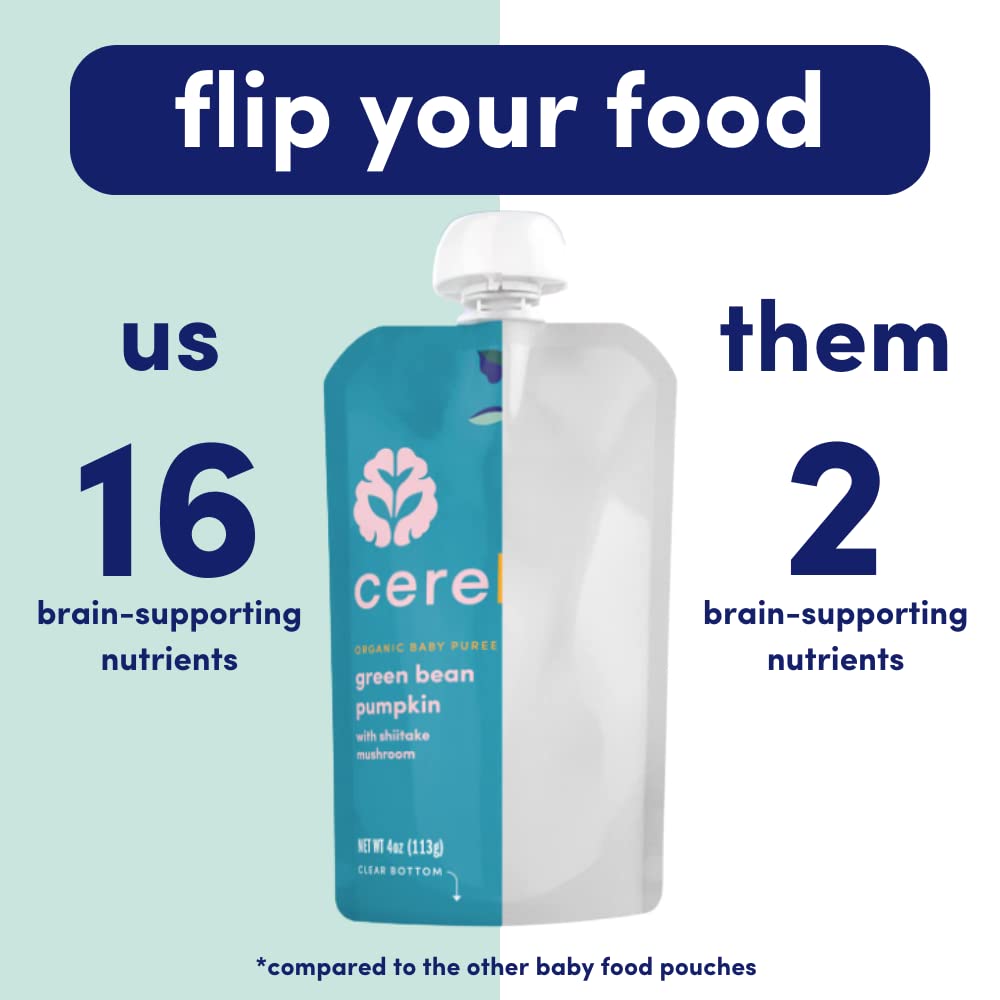 SMART FOOD FOR BABIES - Our Green Bean Pumpkin organic baby pouches were created by a practicing neurosurgeon, Stanford PhD in developmental neurobiology and mom-of-three. And after years of trial and error she developed the perfect baby squeeze pouches. With tasty ingredients and science-backed nutrition, our baby food puree pouches are the best baby snacks (and toddler foods) for your child’s growing brain. Our organic veggie squeeze pouches have astonished moms everywhereSUPPORTS COGNITIVE DEVELOPMENT - Cerebelly organic baby food pouches are the only organic fruit pouch (and veggie pouch) that delivers 16 key brain-supporting nutrients studied by our founder. A delicious blend, high in Zinc, Vitamin E, Selenium, and B-12 supports the development of motor skills like movement control and stabilization, and cognitive abilities like emotional expression, problem solving, and memory. Other veggie pouches for toddlers lack the quality brain nutrients babies need!CLEAN LABEL AWARD SO PARENTS DON'T HAVE TO WORRY - Our toddler food pouches are Clean Label certified. We test for harmful levels of heavy metals and toxins to make sure you are feeding your little one only the highest quality baby food purees. Other companies' toddler snacks and toddler meals may fall short of testing, but Cerebelly is actually the first shelf-stable baby food to receive the Clean Label Project Purity Award. We are raising the bar for organic baby food!ORGANIC INGREDIENTS - This isn’t like your average applesauce squeeze pouch! Crafted from whole foods, including hearty shiitake mushrooms, green beans and harvest pumpkins, we’ve put a fresh, nutritious spin on baby puree. Veggie-first and no added sugar, our organic fruit and vegetable pouches for kids gives your baby what their brain and body needs, right from the start, baby food meals perfect for every stage of development!