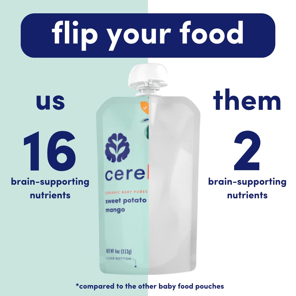 SMART FOOD FOR BABIES - Our Sweet Potato Mango organic baby pouches were created by a practicing neurosurgeon, Stanford PhD in developmental neurobiology and mom-of-three. And after years of trial and error she developed the perfect baby squeeze pouches. With tasty ingredients and science-backed nutrition, our baby food puree pouches are the best baby snacks (and toddler foods) for your child’s growing brain. Our organic veggie squeeze pouches have astonished moms everywhereSUPPORTS COGNITIVE DEVELOPMENT - Cerebelly organic baby food pouches are the only organic fruit pouch (and veggie pouch) that delivers 16 key brain-supporting nutrients studied by our founder. A delicious blend, high in Iron, Copper, Choline, and Folate supports managing speech, the development of visual processing, and cognitive abilities like emotional expression, problem solving, and memory. Other veggie pouches for toddlers lack the quality brain nutrients babies need!CLEAN LABEL AWARD SO PARENTS DON'T HAVE TO WORRY - Our toddler food pouches are Clean Label certified. We test for harmful levels of heavy metals and toxins to make sure you are feeding your little one only the highest quality baby food purees. Other companies' toddler snacks and toddler meals may fall short of testing, but Cerebelly is actually the first shelf-stable baby food to receive the Clean Label Project Purity Award. We are raising the bar for organic baby food!ORGANIC INGREDIENTS - This isn’t like your average applesauce squeeze pouch! Crafted from whole foods, including tart mango pureed with buttery sweet potatoes, we’ve put a fresh, nutritious spin on baby puree. Veggie-first and no added sugar, our organic fruit and vegetable pouches for kids gives your baby what their brain and body needs, right from the start, baby food meals perfect for every stage of development!