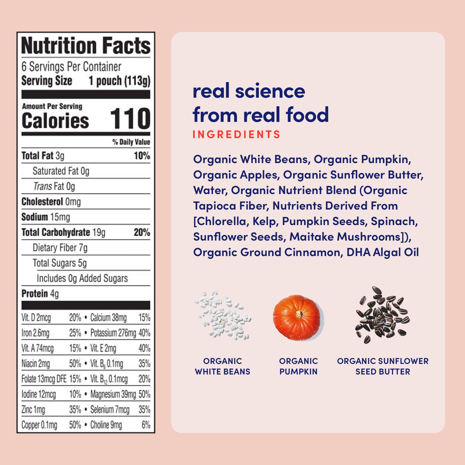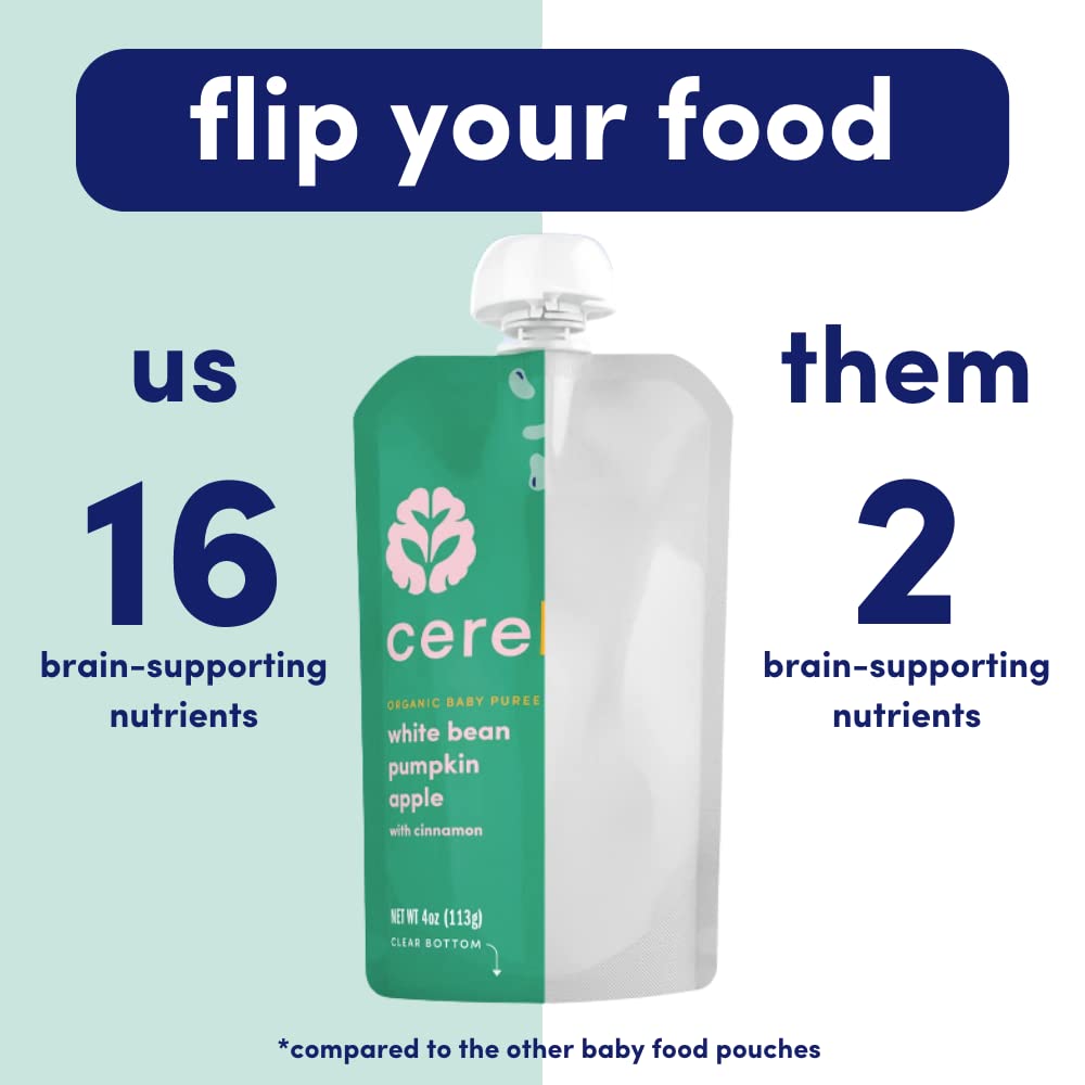 SMART FOOD FOR BABIES - Our White Bean Pumpkin Apple organic baby pouches were created by a practicing neurosurgeon, Stanford PhD in developmental neurobiology and mom-of-three. And after years of trial and error she developed the perfect baby squeeze pouches. With tasty ingredients and science-backed nutrition, our baby food puree pouches are the best baby snacks (and toddler foods) for your child’s growing brain. Our organic veggie squeeze pouches have astonished moms everywhereSUPPORTS COGNITIVE DEVELOPMENT - Cerebelly organic baby food pouches are the only organic fruit pouch (and veggie pouch) that delivers 16 key brain-supporting nutrients studied by our founder. A delicious blend, high in Zinc, Vitamin E, Selenium, and B-12 supports the development of motor skills like movement control and stabilization, and cognitive abilities like emotional expression, problem solving, and memory. Other veggie pouches for toddlers lack the quality brain nutrients babies need!CLEAN LABEL AWARD SO PARENTS DON'T HAVE TO WORRY - Our toddler food pouches are Clean Label certified. We test for harmful levels of heavy metals and toxins to make sure you are feeding your little one only the highest quality baby food purees. Other companies' toddler snacks and toddler meals may fall short of testing, but Cerebelly is actually the first shelf-stable baby food to receive the Clean Label Project Purity Award. We are raising the bar for organic baby food!ORGANIC INGREDIENTS - This isn’t like your average applesauce squeeze pouch! Crafted from whole foods, including sun-ripe apples pureed with velvety white beans and harvest pumpkins, we’ve put a fresh, nutritious spin on baby puree. Veggie-first and no added sugar, our organic fruit and vegetable pouches for kids gives your baby what their brain and body needs, right from the start, baby food meals perfect for every stage of development!