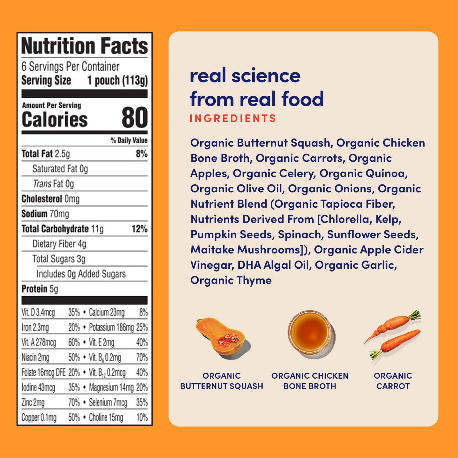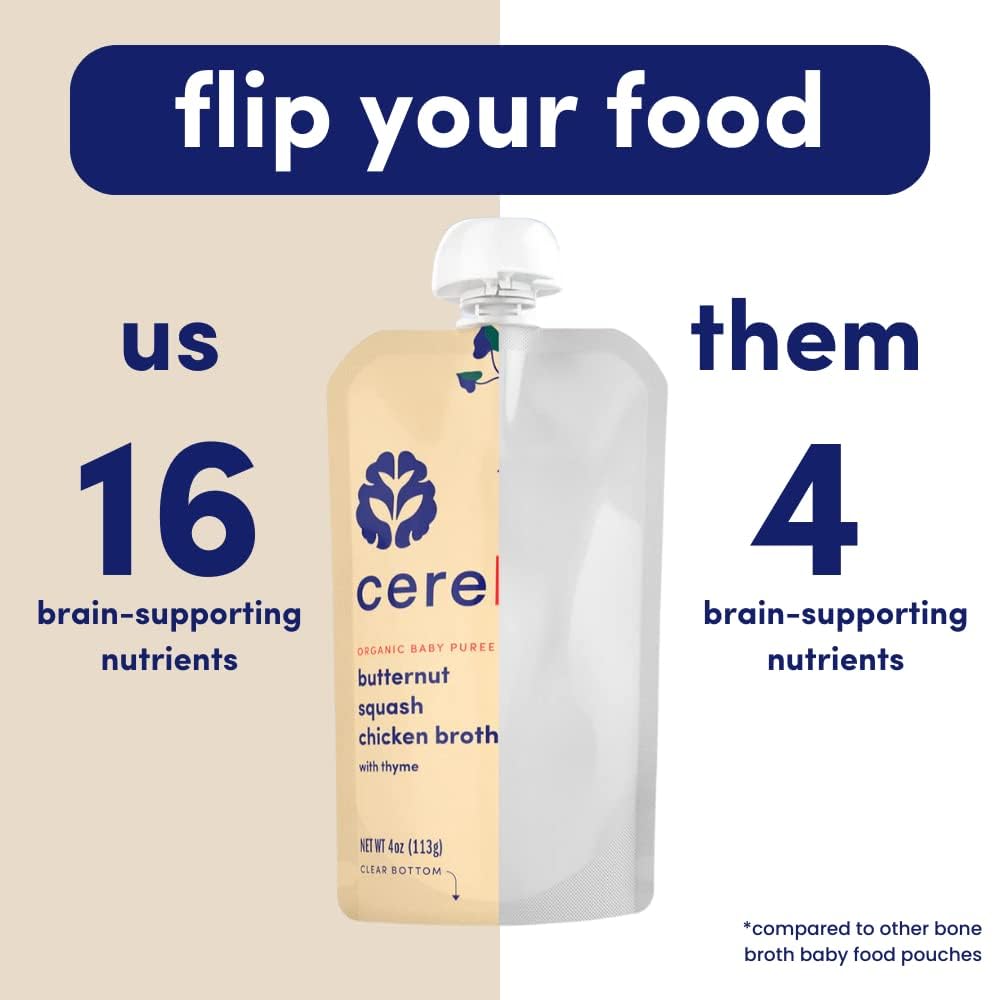 SMART FOOD FOR BABIES NOW WITH BONE BROTH - Our nutrient-dense baby pouch with chicken broth delivers hearty butternut squash with savory chicken bone broth and echoes the warm umami flavors of a roast chicken dinner for your little one! Created by a practicing neurosurgeon, Stanford PhD in developmental neurobiology, and mom-of-three, after years of trial and error she developed the perfect baby squeeze pouches. Backed by science, our toddler pouches are the best for your childās growing brainAN ORGANIC POUCH IRON FORTIFIED BABY FOOD THAT SUPPORTS COGNITIVE DEVELOPMENT - Cerebelly pouches are the only organic baby food puree pouch that delivers 16 key brain-supporting nutrients studied by our founder. A delicious blend high in Zinc, Vitamin E, Selenium, and Vitamin B12 that supports the development of motor skills like movement control and stabilization as well as cognitive abilities like emotional expression, problem solving, and memoryCLEAN LABEL AWARD SO PARENTS DON'T HAVE TO WORRY - Our toddler food pouches are Clean Label certified. We test for harmful levels of heavy metals and toxins to make sure you are feeding your little one only the highest quality baby food purees. Other companies' toddler snacks and toddler meals may fall short of testing, but Cerebelly is actually the first shelf-stable baby food to receive the Clean Label Project Purity Award. We are raising the bar for organic baby food!ORGANIC INGREDIENTS - This isnāt like your average applesauce squeeze pouch! Veggie and chicken baby food pouches stage 1, 2, 3 crafted from whole foods, including organic butternut squash, carrots, and comforting thyme pureed with savory chicken broth! Weāve put a fresh spin on baby puree. Veggie-first and no added sugar, our organic fruit and vegetable pouches for kids gives your baby what their brain and body needs, right from the start, baby food meals perfect for every stage of development!