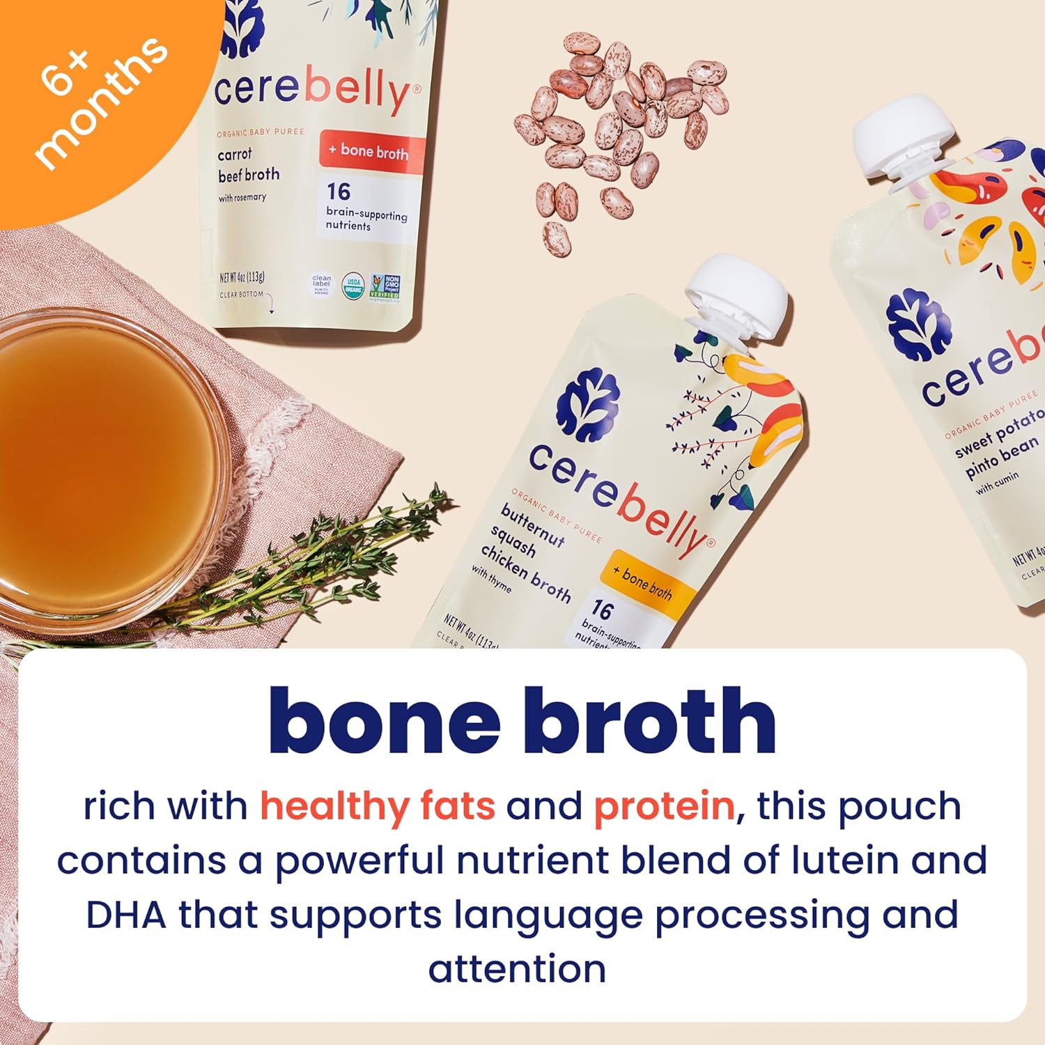SMART FOOD FOR BABIES NOW WITH BONE BROTH - Our nutrient-dense baby pouch with beef broth delivers hearty carrots and onions with savory beef bone broth and echoes the warm flavors of a roast beef dinner for your little one! Created by a practicing neurosurgeon, Stanford PhD in developmental neurobiology, and mom-of-three, after years of trial and error she developed the perfect baby squeeze pouches. Backed by science, our toddler pouches are the best for your childās growing brainAN ORGANIC POUCH IRON FORTIFIED BABY FOOD THAT SUPPORTS COGNITIVE DEVELOPMENT - Cerebelly pouches are the only organic baby food puree pouch that delivers 16 key brain-supporting nutrients studied by our founder. A delicious blend high in Zinc, Vitamin E, Selenium, and Vitamin B12 that supports the development of motor skills like movement control and stabilization as well as cognitive abilities like emotional expression, problem solving, and memoryCLEAN LABEL AWARD SO PARENTS DON'T HAVE TO WORRY - Our toddler food pouches are Clean Label certified. We test for harmful levels of heavy metals and toxins to make sure you are feeding your little one only the highest quality baby food purees. Other companies' toddler snacks and toddler meals may fall short of testing, but Cerebelly is actually the first shelf-stable baby food to receive the Clean Label Project Purity Award. We are raising the bar for organic baby food!ORGANIC INGREDIENTS - This isnāt like your average applesauce squeeze pouch! Veggie and beef baby food pouches stage 1, 2, 3 crafted from whole foods, including hearty carrots and onions, with savory rosemary pureed with beef broth! Weāve put a fresh spin on baby puree. Veggie-first and no added sugar, our organic fruit and vegetable pouches for kids gives your baby what their brain and body needs, right from the start, baby food meals perfect for every stage of development!
