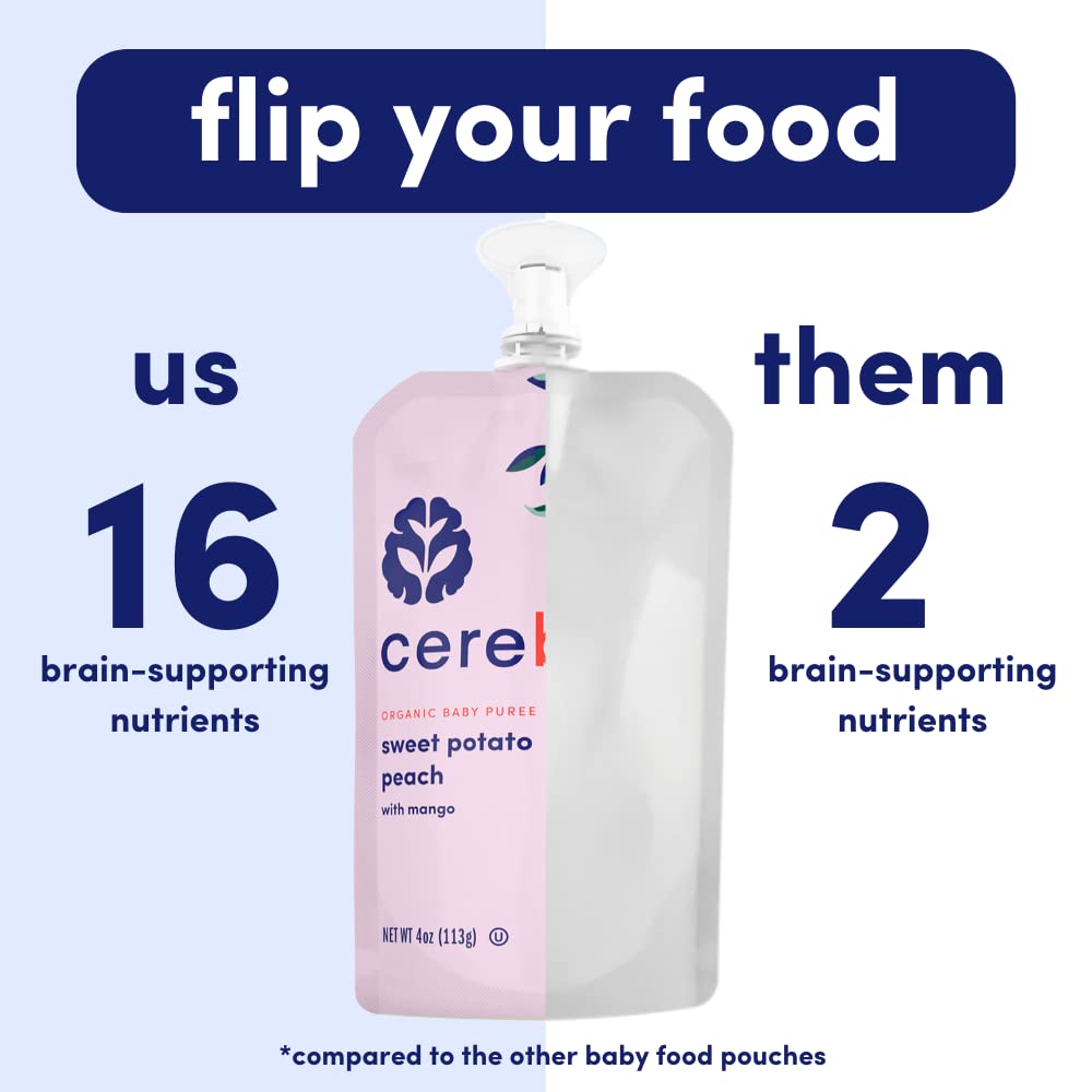 SMART FOOD AND SNACK: Our Sweet Potato Peach pouches were created by practicing neurosurgeon, Stanford PhD in developmental neurobiology and mom-of-three Dr. Teresa Purzner. With tasty ingredients and science-backed nutrition, our smoothie-inspired pouches are the best food for your childās growing brainSUPPORTS COGNITIVE DEVELOPMENT: Our pouches contain 16 key brain-supporting nutrients, including Vitamin A and Vitamin E that supports the development of the frontal lobe and cingulum, these regions help your little oneās emotional and cognitive developmentCLEAN LABEL PROJECT PURITY AWARD WINNER: Weāre raising the bar for baby food! After rigorous testing for over 400 contaminants, we are the first shelf-stable baby food to receive the Clean Label Project Purity Award by the Clean Label ProjectORGANIC INGREDIENTS: Crafted from whole foods, including superfood sweet potato and ripe peach with mango, weāve put a fresh, nutritious spin on baby food. Veggie-first and no added sugar, our organic pouches gives your kid what their brain and body needs, right from the start