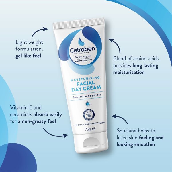 Product Information:Lightweight formulation with a gel-like feel cools & soothes the skin. A blend of aminio acids provide long lasting moisturisation, hydrating squalane helps to leave skin feeling and looking smoother,Features:Smooths And Hydrates For Dry And Eczema Prone Skin Lightweight Formulation Gel Like Feel Cools And Soothes The Skin Long Lasting Moisturisation Non-Greasy,Warning or Restrictions:If the product comes into contact with eyes, rinse with water. Stop use if irritation occurs,Product Specification:Aqua, Glycerin, Cetyl Alcohol, Polyglyceryl-6 Distearate, Caprylic/Capric Triglyceride, Squalane, Ricinus Communis Seed Oil (Castor Seed Oil), Sodium Acrylates Copolymer, Cocos Nucifera (Coconut) Oil, Phenoxyethanol, Jojoba Esters, Avena Sativa Kernel Oil (Oat Kernel Oil), Panthenol, Tocopheryl Acetate, Polyglyceryl-3 Beeswax, Disodium EDTA, Pseudoalteromonas Ferment Extract, Ethylhexylglycerin, Xanthan Gum, Fragrance, Caprylyl Glycol, Lactic Acid, Lecithin, Alanine, Proline, Serine, Sodium Phosphate, Sodium Hydroxide,Product Uses:Apply to cleansed skin. For best results, we recommend using after Cetraben Moisture Protect Facial Cleanser. Have you also tried our Cetraben Nourishing Facial Night Cream,Recyclable:Carton and Tube to be recycled. Keep cap on tube when recycle