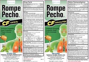 About this item Rompe Pecho CF is an excellent remedy to provide you long-lasting relief from the common cold and flu's annoying symptoms. Our product is ideal for combining medicine with natural ingredients, all of that in a natural honey base. It will help you improve sore throat, and annoying cough. It helps loosen phlegm! Alcohol-Free Cough and Cold Medicine with Expectorant, Cough Suppressant, and Decongestant. Our Formula contains guaifenesin, dextromethorphan, phenylephrine, all these ingredients combined with a unique herbal extract like echinacea, eucalyptus, menthol, and more! See more product details,Rompe Pecho CF is an excellent remedy to provide you long-lasting relief from the common cold and flu's annoying symptoms,Our product is ideal for combining medicine with natural ingredients, all of that in a natural honey base,It will help you improve sore throat, and annoying cough. It helps loosen phlegm!,Alcohol-Free Cough and Cold Medicine with Expectorant, Cough Suppressant, and Decongestant,Our Formula contains guaifenesin, dextromethorphan, phenylephrine, all these ingredients combined with a unique herbal extract like echinacea, eucalyptus, menthol, and more!