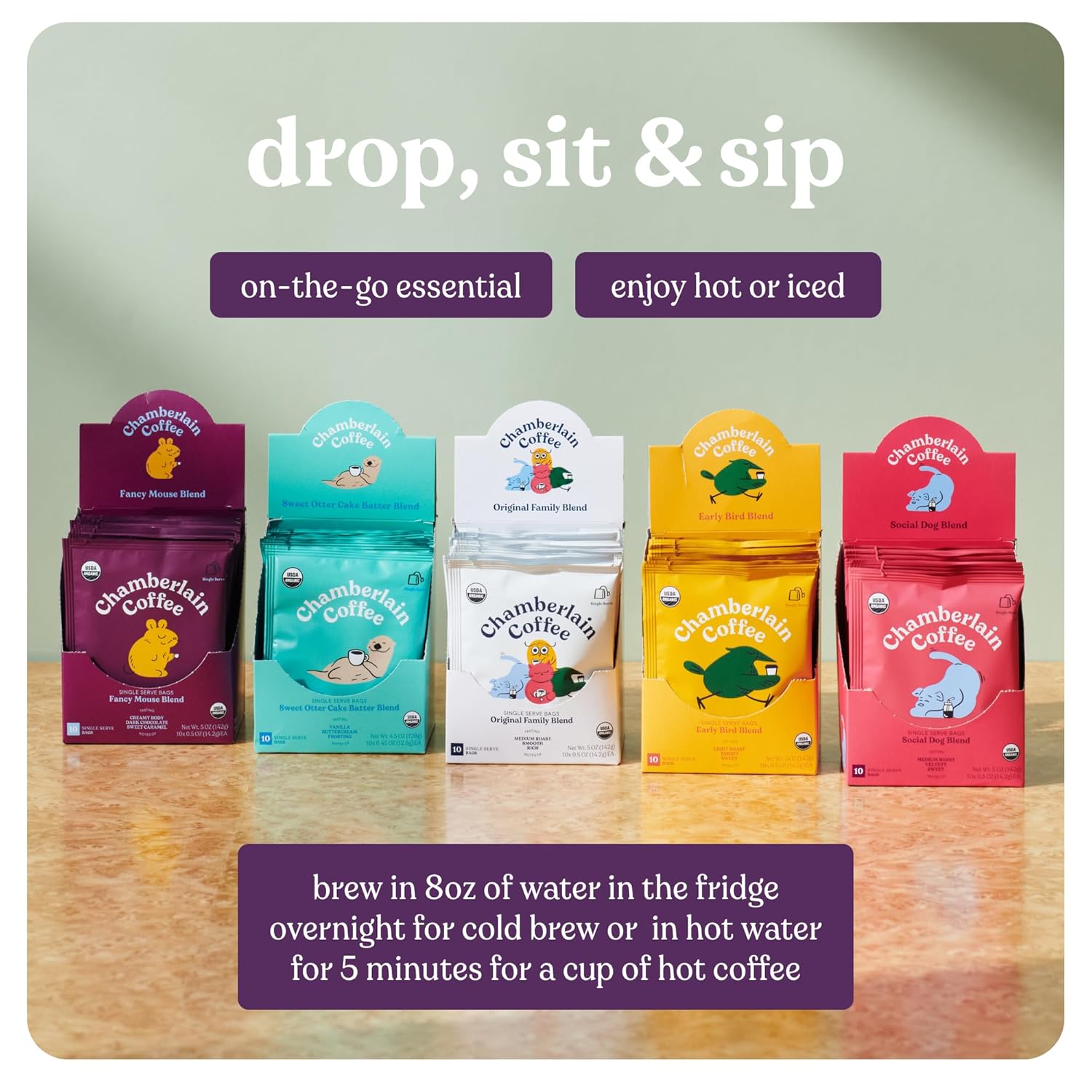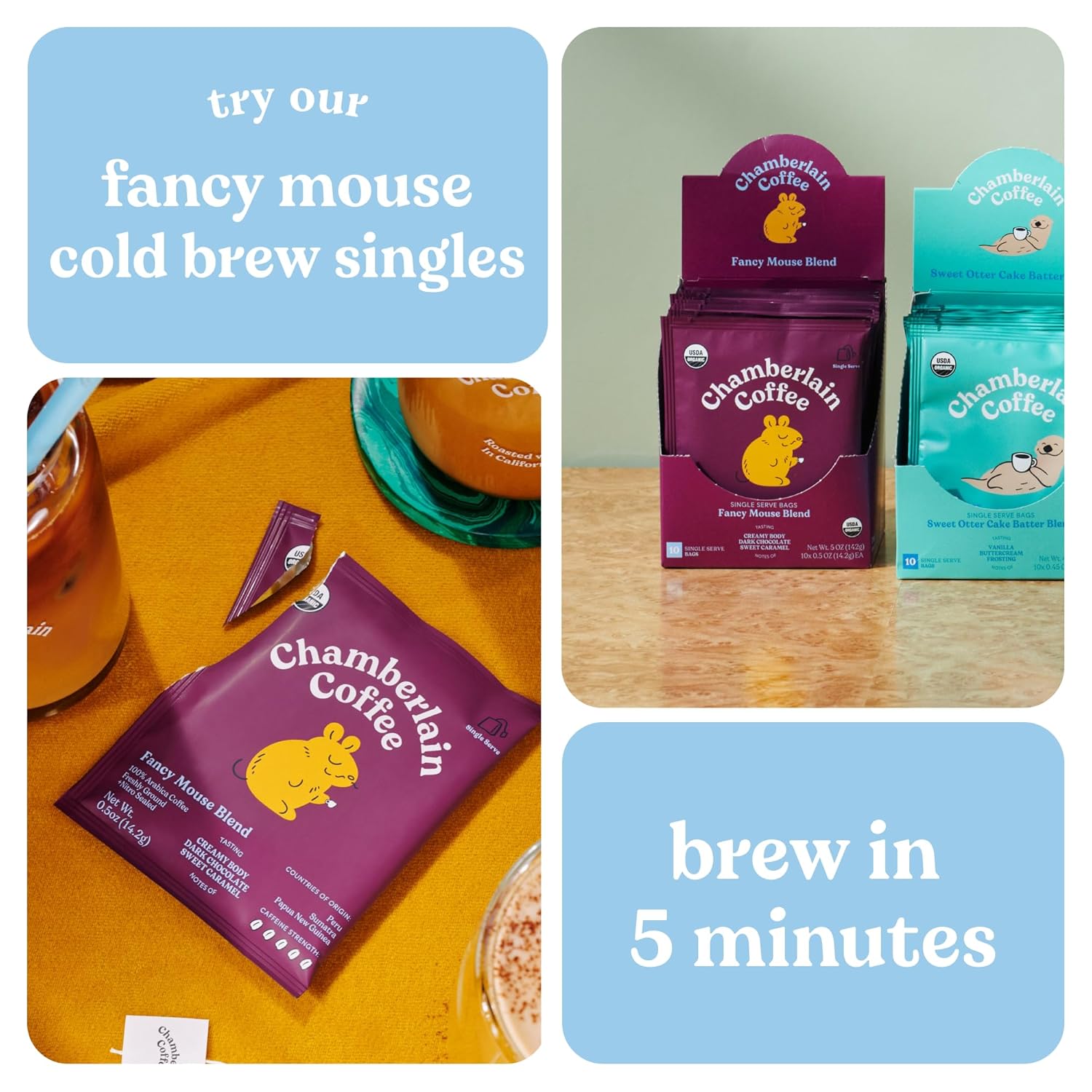 Chamberlain Coffee Fancy Mouse Blend Cold Brew Singles - Dark Roast Organic Coffee Single Serve Bags With Notes Of Creamy Dark Chocolate & Sweet Caramel - 10 Single Serve Cold Brew Sachets