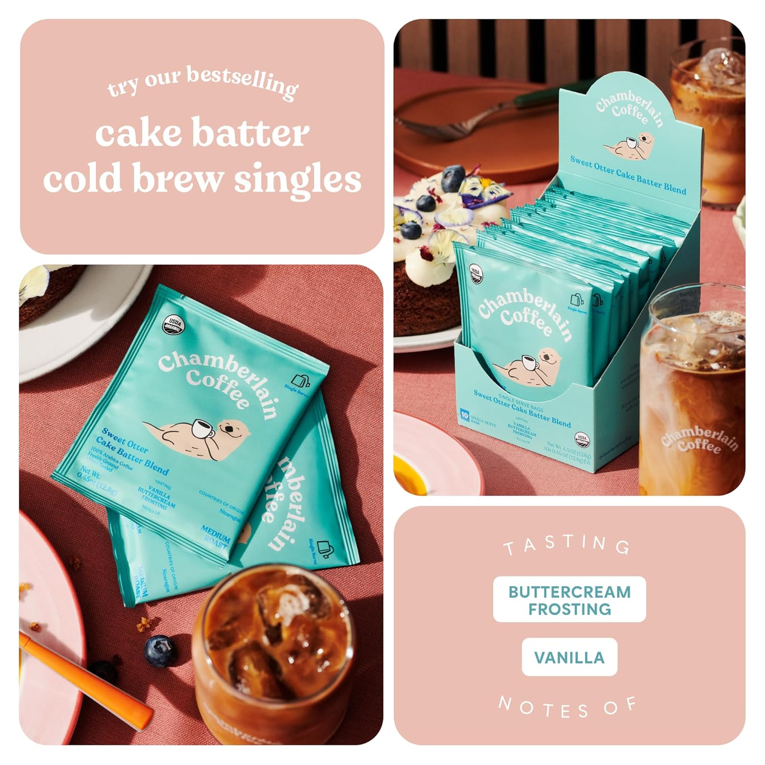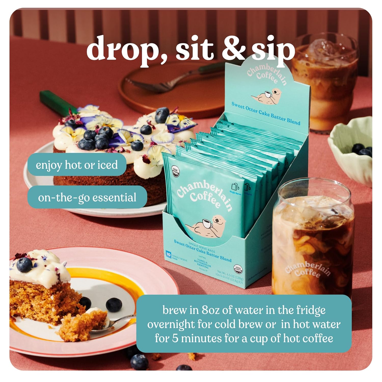 Chamberlain Coffee Sweet Otter Cake Batter Cold Brew Singles - Cold Brew Coffee Bags With Notes Of Vanilla & Frosting - 10 Single Serve Cold Brew Sachets