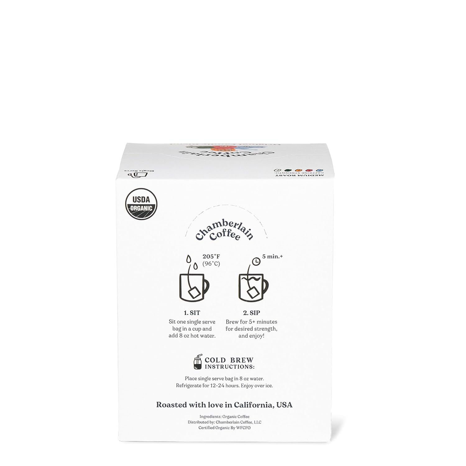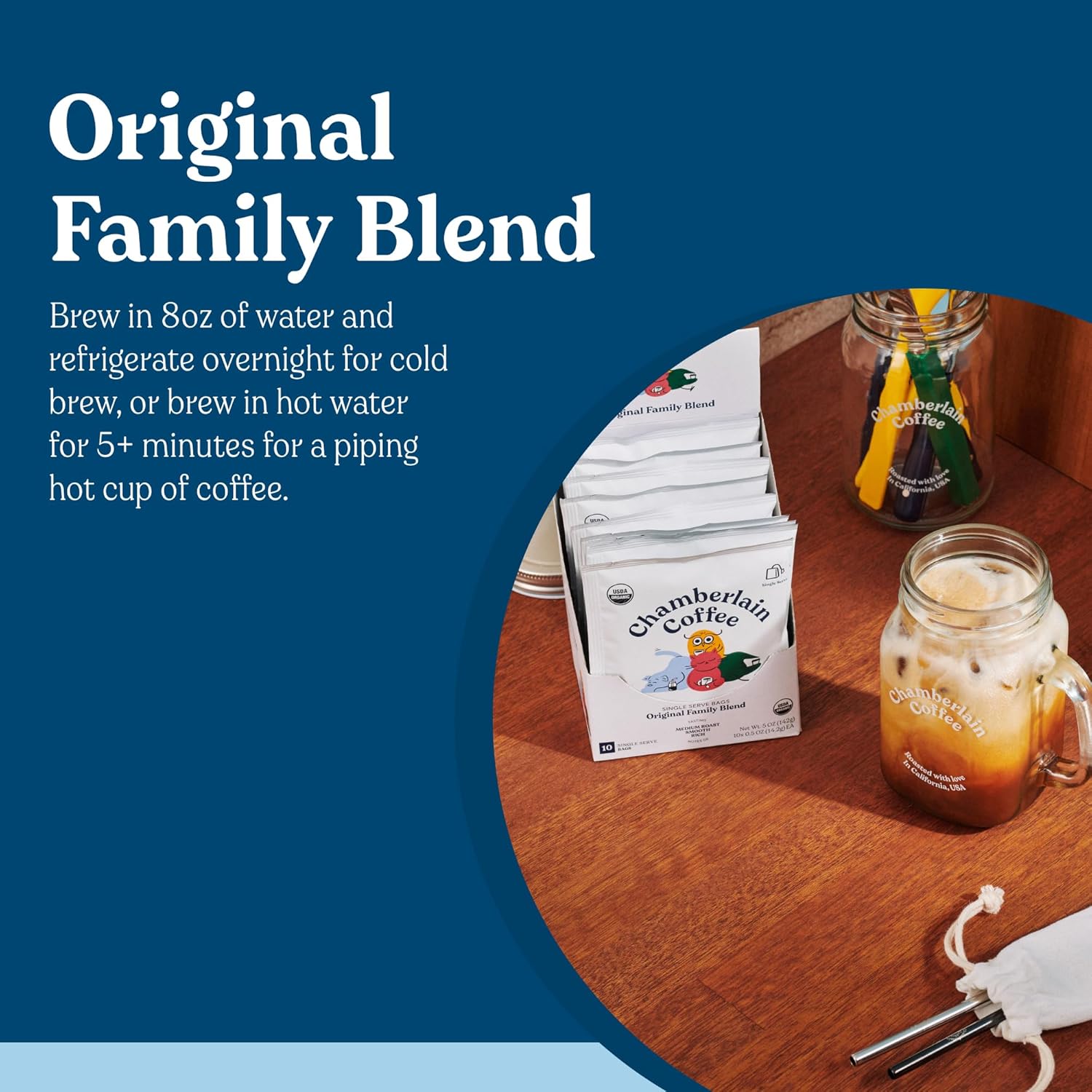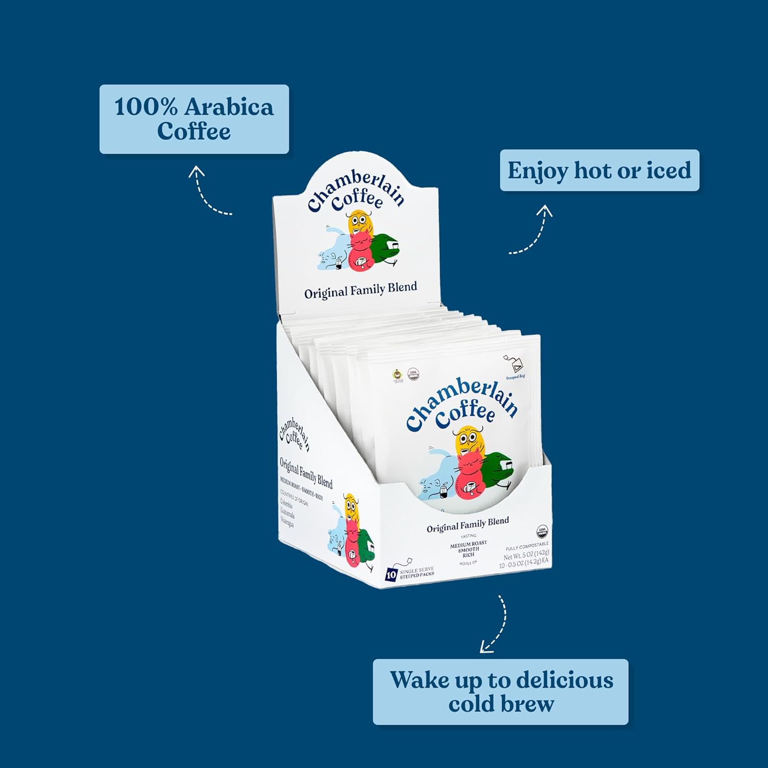 Chamberlain Coffee The Original Family Blend Cold Brew Singles - Medium Roast Organic Coffee Single Serve Bags With Notes Of Rich Milk Chocolate, Almond & Black Cherry - 10 Single Serve Cold Brew Sachets