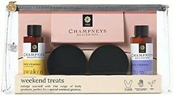 Champneys Weekend Treats Includes: Champneys Awaken Body Cleanser 50ml Champneys Calm Body Balm 50ml Champneys Slumber Body Balm 50ml Champneys Slumber Body Cleanser 50ml At Champneys wellness is a way of life. As the UK's original health spa we've inspired generations to rest and re-energise since 1925. Believers that beauty is more than skin deep, we pour spa inspired ingredients and pioneering wellbeing expertise into every bottle. Formulated with inner peace in mind, each product is designed to help you back to your best. Uncurl your shoulders, escape the outside world and transport your senses to our countryside spa. How to use Champneys Body Cleanser: OUR THERAPISTS RECOMMEND: Squeeze a drop onto your body polisher or sponge and work up into a rich lather on your body. After allowing a few moments for the scent to sink in, rinse well in warm water and gently towel dry. Champneys Body Balm: OUR THERAPISTS RECOMMEND: Squeeze a drop onto your body polisher or sponge and work up into a rich lather on your body. After allowing a few moments for the scent to sink in, rinse well in warm water and gently towel dry,Champneys Awaken Body Cleanser 50ml,Champneys Calm Body Balm 50ml,Champneys Slumber Body Balm 50ml,Champneys Slumber Body Cleanser 50ml
