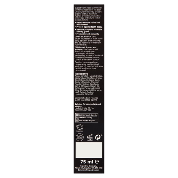 Product Information:Gum Health Charcoal Toothpaste,Benefit:With Maximum Fluoride Protection, Helps Keep Teeth And Gums Healthy, Whitening Toothpaste,Warning Or Restrictions:Use A Pea Sized Amount For Supervised Brushing To Minimize Swallowing. In Case Of Intake Of Fluoride From Other Sources Consult A Dentist Or Doctor,Product Specification:Aqua, Sorbitol, Hydrated Silica, Sodium Lauryl Sulfate, Aroma, Cellulose Gum, Zinc Citrate, Sodium Fluoride, Charcoal Powder, Sodium Saccharin, Salvia Officinalis (Sage) Oil, Echinacea Purpurea Extract, Aloe Barbadensis Leaf Extrac, Sodium Hydroxide, Ci 74260,Product Uses:Brush Your Teeth At Least Twice A Day,Recyclable:Carton - Card - Widely Recycled. Cap - Plastic - Check Local Recycling. Tube - Mixed Materials - Not Currently Recycled