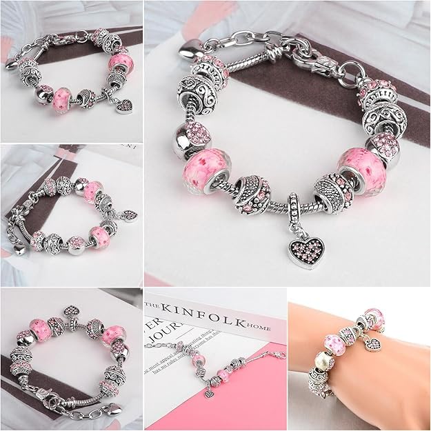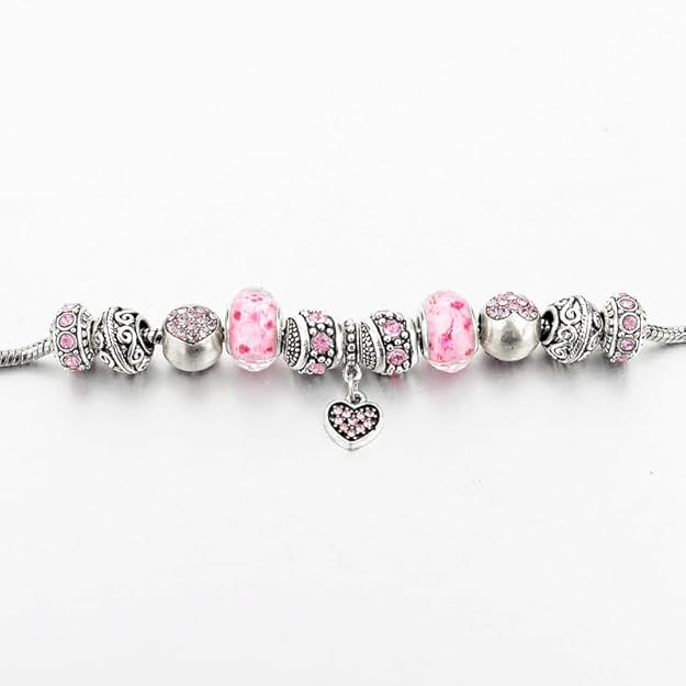 Charming Pink Hearts Bracelet – Silver Plated Charms & Adjustable Snake Chain, Elegant Beaded Jewelry Gift