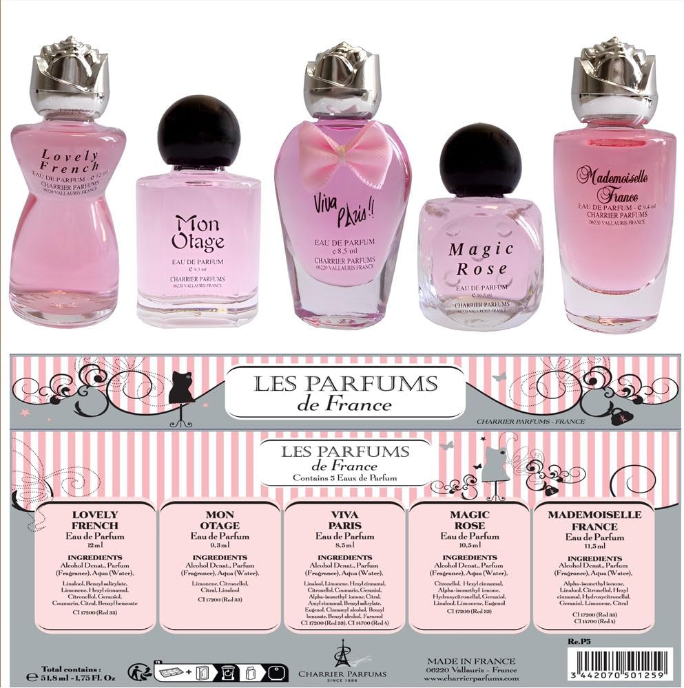 About this item CHARRIER PARFUMS, french perfumer since 1888 A gift set of 5 miniature bottles of Eaux de Parfum - Total contains : 49.7 ml - 1.68 FL.Oz A fragrance for every moment, a fragrance for every desire. Lovely French, Mon Otage, Viva Paris, Magic Rose, Mademoiselle France Made in Vallauris near Grasse, France, world capital of perfumery Please see Heart and Base Note in Product description below › See more product details,CHARRIER PARFUMS, french perfumer since 1888,A gift set of 5 miniature bottles of Eaux de Parfum - Total contains : 49.7 ml - 1.68 FL.Oz,A fragrance for every moment, a fragrance for every desire. Lovely French, Mon Otage, Viva Paris, Magic Rose, Mademoiselle France,Made in Vallauris near Grasse, France, world capital of perfumery,Please see Heart and Base Note in Product description below
