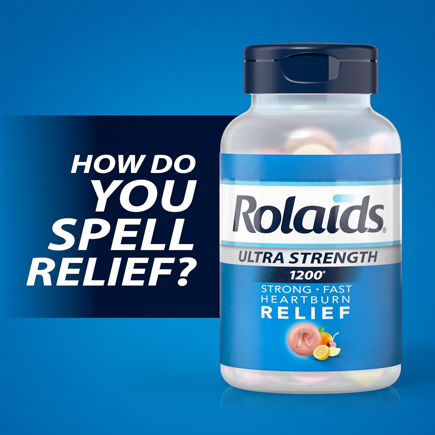 About this item CONTAINS: One (1) 72-count bottle of Rolaids Ultra Strength Antacid Chewable Tablets, Assorted Fruit flavors OLAIDS ULTIMATE ACID-NEUTRALIZING HEARTBURN RELIEF: Rolaids Ultra Strength antacid tablets neutralize more than 100 times their own weight in stomach acid* GOES TO WORK INSTANTLY: Chewable antacid tablets with calcium carbonate and magnesium hydroxide start to work immediately to help relieve heartburn, acid indigestion, and sour stomach CONVENIENT: Chew 2-3 tablets as symptoms occur or as directed by a doctor; do not take more than 7 tablets in 24 hours; do not use the maximum dosage for more than 2 weeks ASSORTED FRUIT FLAVOR: This heartburn relief tablet comes in an assorted fruit flavor See more product details,CONTAINS: One (1) 72-count bottle of Rolaids Ultra Strength Antacid Chewable Tablets, Assorted Fruit flavors,OLAIDS ULTIMATE ACID-NEUTRALIZING HEARTBURN RELIEF: Rolaids Ultra Strength antacid tablets neutralize more than 100 times their own weight in stomach acid,GOES TO WORK INSTANTLY: Chewable antacid tablets with calcium carbonate and magnesium hydroxide start to work immediately to help relieve heartburn, acid indigestion, and sour stomach,CONVENIENT: Chew 2-3 tablets as symptoms occur or as directed by a doctor; do not take more than 7 tablets in 24 hours; do not use the maximum dosage for more than 2 weeks,ASSORTED FRUIT FLAVOR: This heartburn relief tablet comes in an assorted fruit flavor