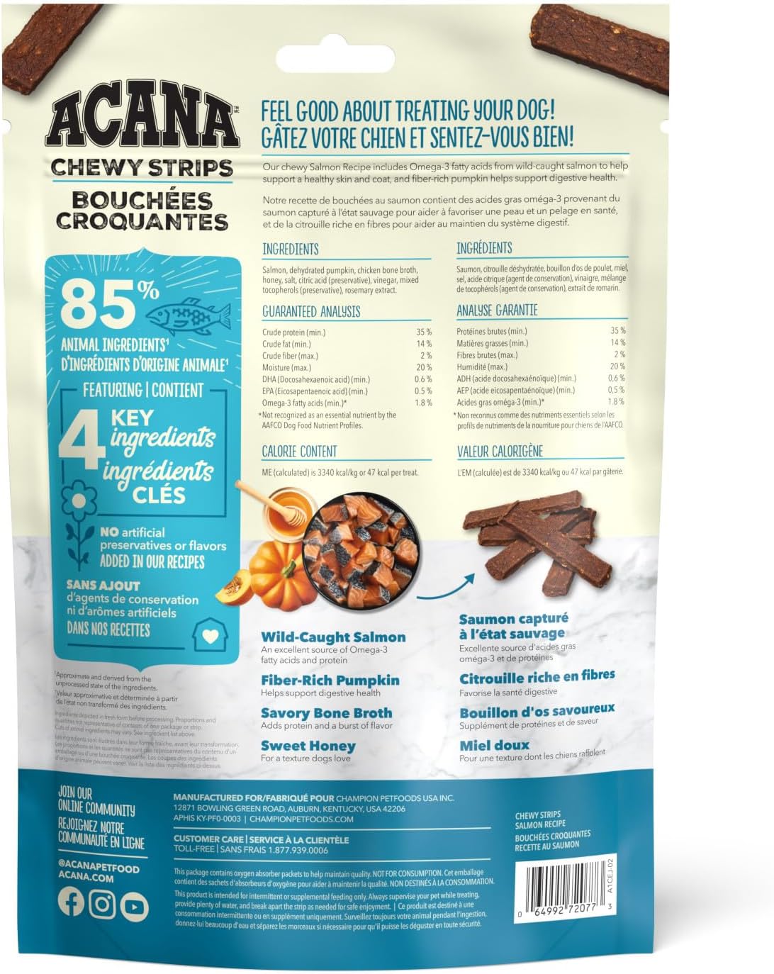 Bring Home Quality Nutrition In A Delicious Treat For Your Dog With Acana Chewy Strips Salmon Dog Treats. Crafted With Ingredients You Can Feel Good About, This Dog Treat Recipe Features Protein-Rich, Wild-Caught Salmon And Bone Broth Plus Fiber-Rich Pumpkin To Help Support Gut Health. Sweet Honey Adds A Soft, Chewy Texture To These High Protein Dog Treats To Keep Your Dog Satisfied, Making Them A Perfect Snack When You Want To Treat Your Dog To Delicious Flavor And Happiness. These Acana Dog Treats Are Made With 85 Percent* Animal Ingredients To Provide A Burst Of Protein And Tempting Flavor. No Artificial Preservatives, Flavors Or Colors Added In Our Kitchen And No Low-Cost Ingredients Like Soy, Corn, Tapioca Or Wheat To Ensure Your Furry Family Member Gets Only The Best. Even Better, Nutritious Ingredients Like Omega-3 Fatty Acids From Salmon And Fiber From Pumpkin Help Support Your Dog'S Skin, Coat And Digestive Health. Choose Acana Treats To Give Your Companion The Nutritional Foundation They Need To Live A Happy, Healthy Life. *Approximate And Derived From The Unprocessed State Of The Ingredients