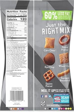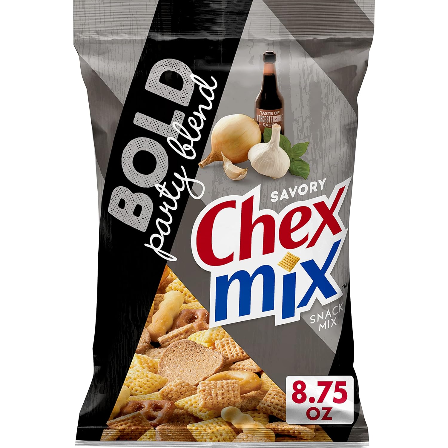 When it comes to snacking, go from bland to BOLD with Chex Mix Bold Party Blend Savory Snack Mix. This party mix gives you a deliciously unpredictable combination of shapes, tastes and textures with a spicy bold finish. With 60% less fat than regular potato chips, this snack mix makes a great choice for school snacks, travel foods and moreCHEX MIX: Snack Mix loaded with fun, flavorful shapes of Chex, pretzels, rye chips, breadsticks and moreSAVORY SNACK MIX: Keep the party interesting with a zesty array of corn Chex, wheat Chex, mini breadsticks, pretzels and rye chipsPARTY FAVORITE: Endless taste and texture combinations make it the perfect party mix snack for get-togethers of all shapes and sizes; Not your standard pub mix, trail mix, or bar snackEASY AND PORTABLE: Stock your pantry with these delicious snack pack to share with friends and family