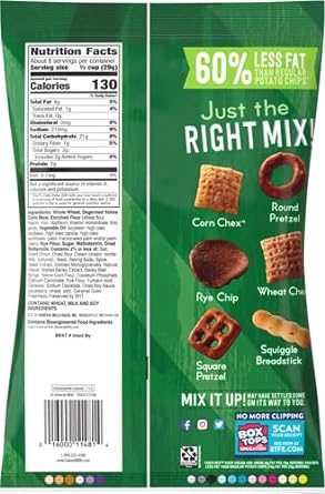 Grab fun by the handful with Chex Mix and savor the Sour Cream & Onion flavor. You’ll love the flavor combination and savor every bite. Chex Mix Sour Cream and Onion Savory Snack Mix features a flavor combination of shapes, tastes and deliciousness and offers something for your whole family to enjoy. With 60% less fat than regular potato chips, this snack mix makes a great choice for after-school snacks, office snacks or travel snacks. Chex Mix pieces include crispy Corn Chex, Wheat Chex, pretzels, rye chips, and mini breadsticks. It's not your standard pub mix, trail mix, or bar snack. The endless taste and texture combinations make it the perfect party mix snack for get-togethers of all shapes and sizes. Contains one 8.75 oz snack bagCHEX MIX: Snack Mix loaded with fun, flavorful shapes of Chex, pretzels, rye chips, breadsticks and moreSAVORY SNACK MIX: With Corn Chex, Wheat Chex, pretzels, rye chips, and mini breadsticks lightly seasoned in a Sour Cream and Onion flavor, you’ll get crunchy and delicious all in onePARTY FAVORITE: Endless taste and texture combinations make it the perfect party mix snack for get-togethers of all shapes and sizes; Not your standard pub mix, trail mix, or bar snackEASY AND PORTABLE: Stock your pantry with these delicious snack packs to share with friends and family