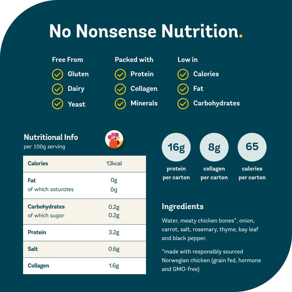 About this item WHAT IS BONE BROTH : An award winning premium broth made from meaty bones, herbs and vegetables, intensely simmered for up to 24 hours then strained to leave a clear liquid. Bone Broth is compatible with intermittent fasting, ketogenic, paleo, low-carb, dairy-free and gluten-free diets. SERIOUS ABOUT SUSTAINABILITY: Our chicken is sourced for the highest environmental and welfare standards from Norwegian cooperative farmers - equivalent to British organic requirements. Hormone-free, non-GMO, packed in fully recyclable cartons, made from 90% renewable materials. THE FOUNDATION OF FLAVOUR: Made from natural ingredients and tastes better than homemade. Best enjoyed simply warmed and sipped from a mug, or used as a hero ingredient to enhance any dish. NO NONSENSE NUTRITION: Bone Broth is a foundational health food: it’s a low calorie gut health essential, an immune system booster and a great source of protein, collagen and amino acids - a nutritional powerhouse to make you feel great. CONVENIENCE WITHOUT COMPROMISE: Our bone broth is a store-cupboard essential (up to 24 month shelf life) packed in handy 500ml resealable cartons. Simmered for hours, ready in seconds! › See more product details,WHAT IS BONE BROTH : An award winning premium broth made from meaty bones, herbs and vegetables, intensely simmered for up to 24 hours then strained to leave a clear liquid. Bone Broth is compatible with intermittent fasting, ketogenic, paleo, low-carb, dairy-free and gluten-free diets,SERIOUS ABOUT SUSTAINABILITY: Our chicken is sourced for the highest environmental and welfare standards from Norwegian cooperative farmers - equivalent to British organic requirements. Hormone-free, non-GMO, packed in fully recyclable cartons, made from 90% renewable materials,THE FOUNDATION OF FLAVOUR: Made from natural ingredients and tastes better than homemade. Best enjoyed simply warmed and sipped from a mug, or used as a hero ingredient to enhance any dish,NO NONSENSE NUTRITION: Bone Broth is a foundational health food: it’s a low calorie gut health essential, an immune system booster and a great source of protein, collagen and amino acids - a nutritional powerhouse to make you feel great,CONVENIENCE WITHOUT COMPROMISE: Our bone broth is a store-cupboard essential (up to 24 month shelf life) packed in handy 500ml resealable cartons. Simmered for hours, ready in seconds!