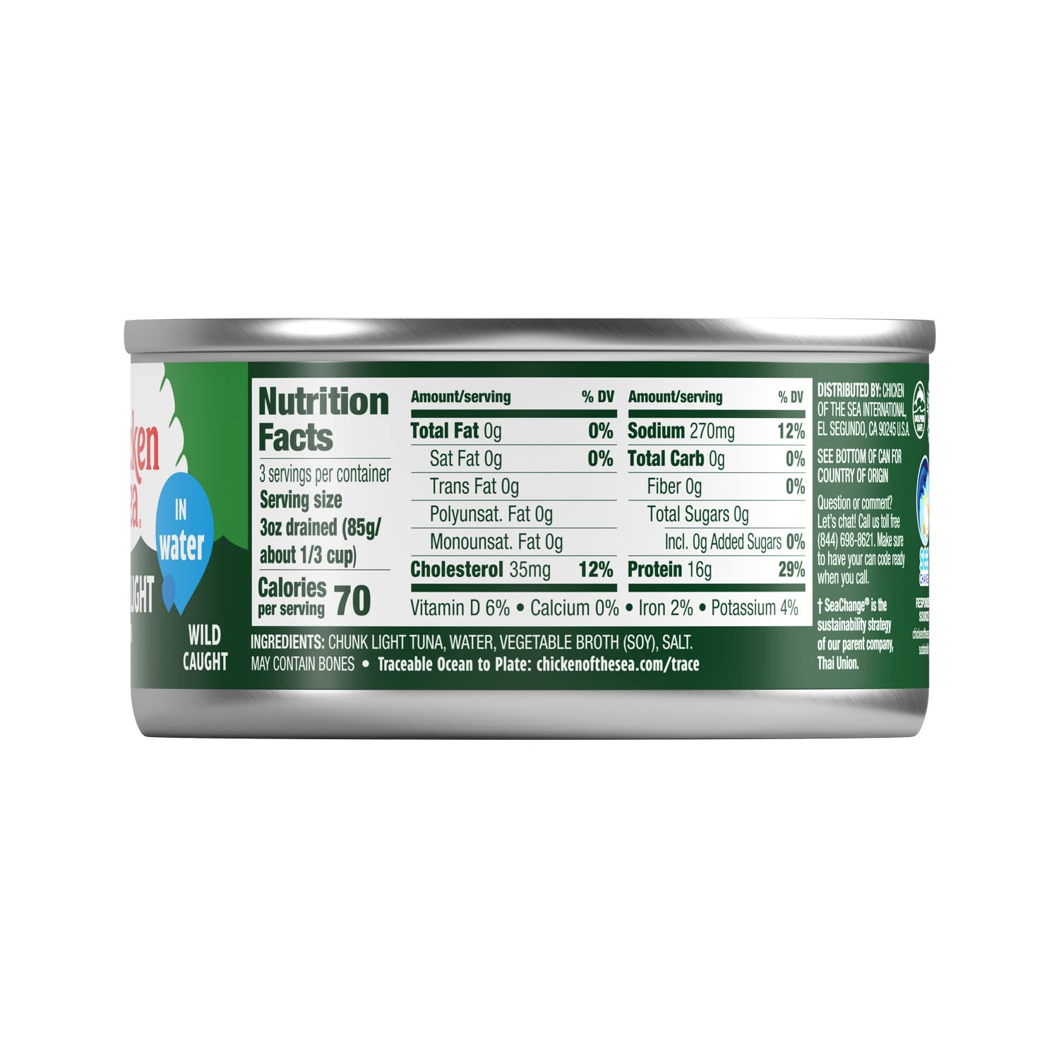 Pack of twenty four, 12-ounce per can (total of 288 ounces)10Chicken of the Sea is now proud to offer MSC certified products. It’s the next step in our deep commitment to ocean sustainability10High in protein and rich in omega-3 fatty acids, salmon delivers the nutrients to help protect joints, improve vision health, and even benefit sleep10Contains 12 pack of 12oz Light Tuna Water10Fast, easy, convenient, healthy meal for anytime and on the go. Excellent source of protein at a great price10Product Description Chicken of the Sea Chunk Light Tuna in Water consists of prime skipjack and yellowfin tuna with a mild flavor, pleasing texture and appearance. Low in fat (0.5 grams of fat per serving), light meat tuna is considered an excellent source of protein for a great price. Manufacturer Contact Information PO Box 308, Mt Olive, NJ 07828