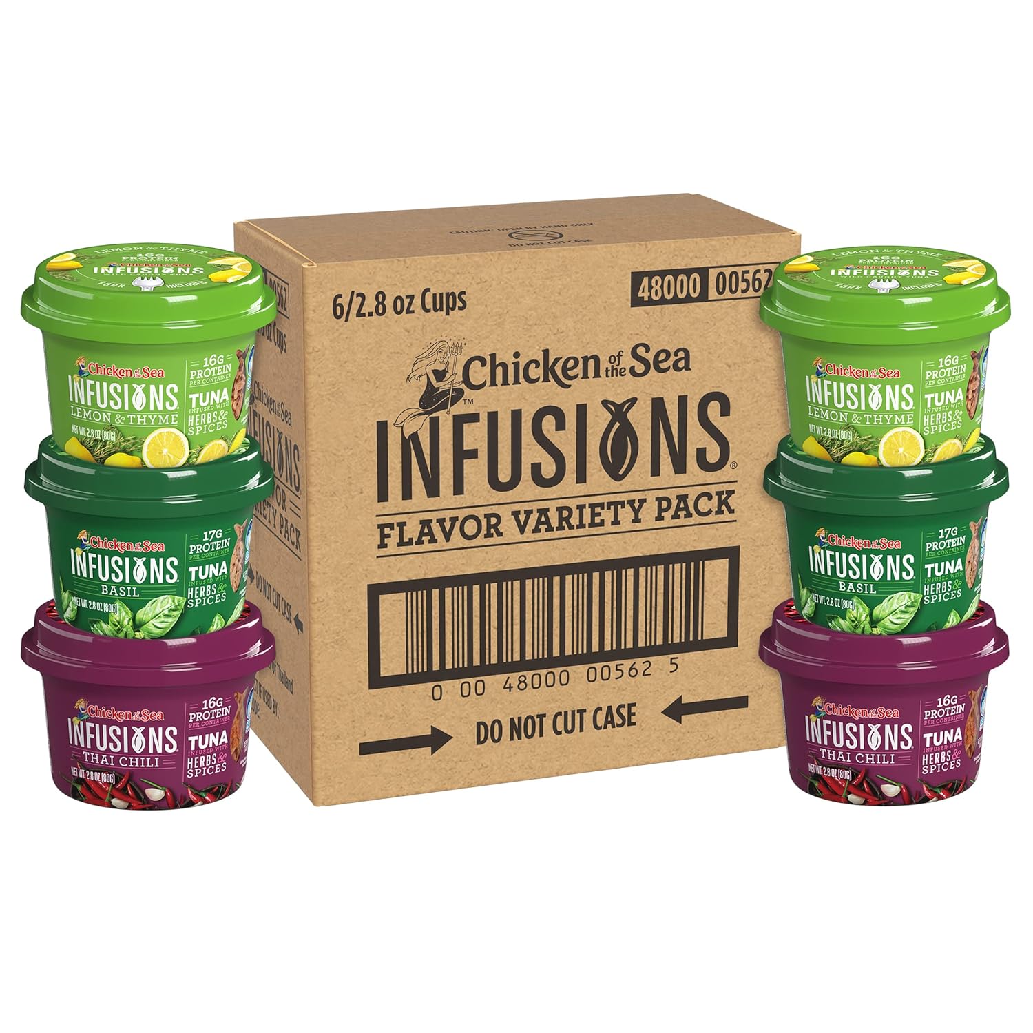 DELICIOUS FLAVOR: Tender chunks of premium, wild caught tuna in water, infused with real herbs and spices. Six 2.8oz cups: 2 Basil, 2 Lemon & Thyme, and 2 Thai Chili10HIGHLY NUTRITIOUS: Every cup contains 16+ grams of lean protein, and heart-healthy omega-3s with very little fat and carbsâperfect for keto, paleo, and Mediterranean diets10100% WILD-CAUGHT: Our premium Infusions Tuna contains only wild-caught tuna10RESPONSIBLY SOURCED TUNA: We're proud to offer only responsibly sourced skipjack tuna10READY-TO-EAT CUP: Recyclable cup and tuck-away fork require no can opener or draining, so you can just peel it open and go10DELICIOUS FLAVOR: Tender chunks of premium, wild caught tuna in water, infused with real herbs and spices. Six 2.8oz cups: 2 Basil, 2 Lemon & Thyme, and 2 Thai Chili. HIGHLY NUTRITIOUS: Every cup contains 16+ grams of lean protein, and heart-healthy omega-3s with very little fat and carbsâperfect for keto, paleo, and Mediterranean diets. 100% WILD CAUGHT: Our premium Infusions Tuna contains only wild-caught tuna. RESPONSIBLY SOURCED TUNA: We're proud to offer only responsibly sourced skipjack tuna. READY-TO-EAT CUP: Recyclable cup and tuck-away fork require no can opener or draining, so you can just peel it open and go