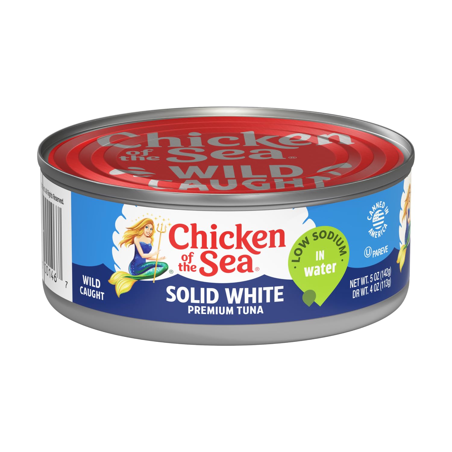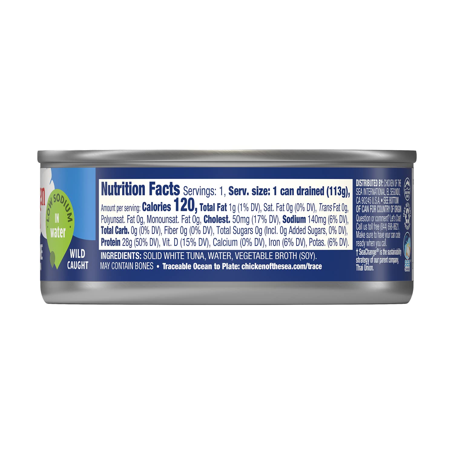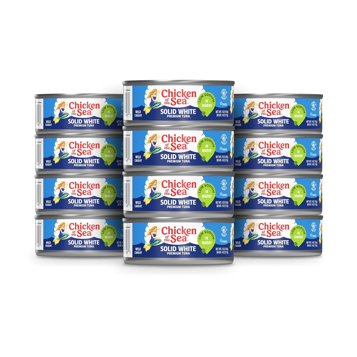 DELICIOUS, MILD FLAVOR: Chicken of the Sea Solid White Albacore Tuna in Water, Low Sodium, is made with premium albacore tuna filets, perfectly seasoned and packed in water for a pure, clean, mild flavor10VERSATILE PANTRY INGREDIENT BULK 12 PACK - Canned albacore tuna in water is perfect for salads, pastas, wraps, and more. Try it in your go-to recipes. Stock up on tuna and save! Classic canned tuna is the perfect pantry staple, ready whenever you need a satisfying snack or a hearty dinner on short notice10HIGHLY NUTRITIOUS: Our low sodium albacore tuna canned in water has 50% less sodium than our regular 5 oz. can, is high in protein, and features heart-healthy omega-3s, and vitamin D with very little fat and no carbs—perfect for keto, paleo, and Mediterranean diets. One 4-ounce serving of our low sodium solid white albacore tuna in water contains 28 grams of protein, 140 grams of sodium, 0 grams of carbs, and just 1 gram of fat10RESPONSIBLY SOURCED WILD ALBACORE TUNA: Chicken of the Sea is proud to offer responsibly sourced, wild caught albacore tuna10100% SIMPLE INGREDIENTS: Our solid white tuna contains simple ingredients, with no GMOs or preservatives. It’s also gluten-free10DELICIOUS, MILD FLAVOR: Chicken of the Sea Solid White Albacore Tuna in Water, low sodium, is made with premium albacore tuna filets, perfectly seasoned and packed in water for a pure, clean, mild flavor. VERSATILE PANTRY INGREDIENT: Canned albacore tuna in water is perfect for salads, pastas, wraps, and more. Try it in your go-to recipes. HIGHLY NUTRITIOUS: Our low sodium albacore tuna canned in water has 50% less sodium than our regular 5 oz. can, is high in protein, and features heart-healthy omega-3s, and vitamin D with very little fat and no carbs—perfect for keto, paleo, and Mediterranean diets. One 4-ounce serving of our low sodium solid white albacore tuna in water contains 28 grams of protein, 140 grams of sodium, 0 grams of carbs, and just 1 gram of fat. RESPONSIBLY SOURCED WILD ALBACORE TUNA: Chicken of the Sea is proud to offer responsibly sourced, wild caught albacore tuna. 100% SIMPLE INGREDIENTS: Our solid white tuna contains simple ingredients, with no GMOs or preservatives. It’s also gluten-free. BULK 12 PACK: Stock up on tuna and save! Classic canned tuna is the perfect pantry staple, ready whenever you need a satisfying snack or a hearty dinner on short notice