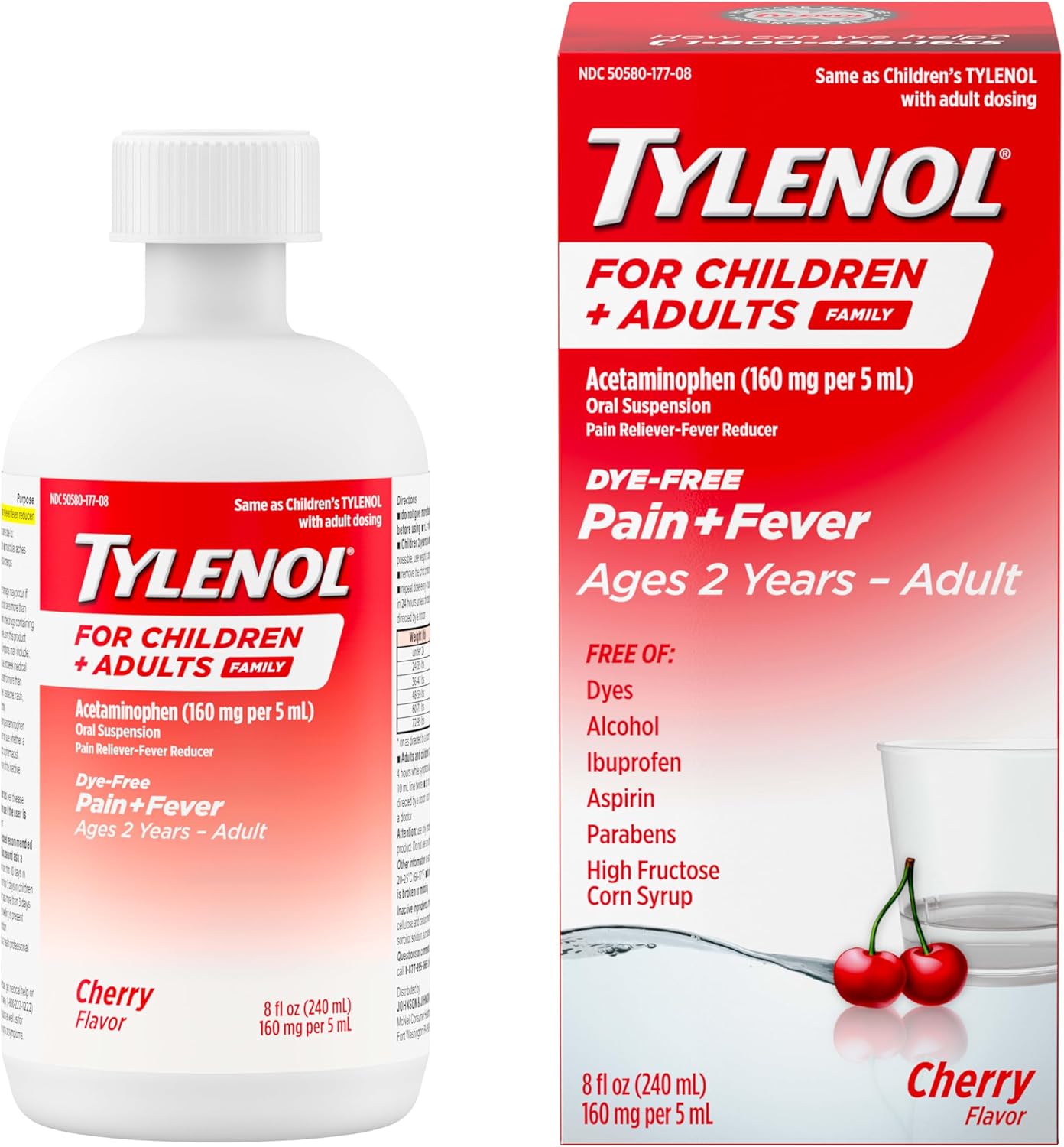 LIQUID PAIN & FEVER REDUCER: Tylenol Liquid Oral Suspension with acetaminophen can be used by the whole family for pain relief and fever reduction, comes in a dye free cherry flavor, is gentle on the tummy; indicated for adults and children 2+