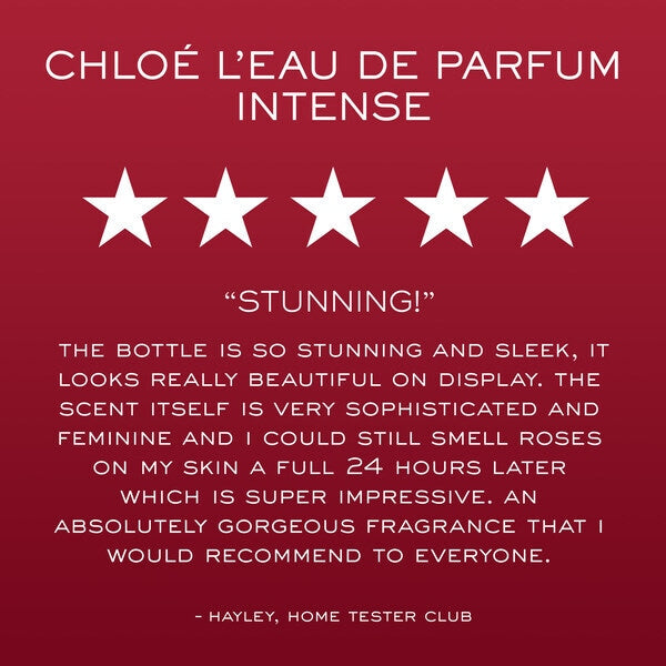 Product Information:We are Chloé. Chloé L’Eau de Parfum Intense captures the emotion and energy of Chloé through four inspiring women who embody the values of the brand. Of different ages and from different backgrounds, they are beautiful, strong, and free. Surrounded by lush nature, they change the direction of the wind itself. A breath of feminine energy spreads to the four corners of the world. A wave of joy, optimism, and freedom. The expression of the power of women according to Chloé. The Fragrance Chloé L’Eau de Parfum Intense is an addictive floral fragrance for women that opens with vibrant, juicy raspberry notes, underlining the sensuality of the rose that lies beneath. As alive as if captured at any moment of the day, its strong fragrance evokes at once the fresh morning rose, green and slightly crisp, the open midday rose, rich and deep, and the honeyed evening rose, with its sensual, addictive accents. Then, a bouquet of warm and ambery woods unfolds, each more concentrated than the last. Ambrox brings its musky, woody notes, Cashmeran offers its voluptuous sensuality, and cedar reinforces the fragrance’s unique character. A Chloé fragrance that's perfect for any occasion and lasts all day long. The Bottle For L’Eau de Parfum Intense, the famous pleated Chloé perfume bottle has been given a new look, now stamped with a sleek black and ecru label for an even more modern and refined style. Its ribbon has also taken on a new, deep garnet hue, echoing the fragrance's composition and the flower at its heart. How To Refill This fragrance has a vegan formula and is available in 30 ml, 50 ml or 100 ml refillable bottles. Refill sold separately. When your fragrance runs out, use the 150ml refill to refill your L’Eau de Parfum Intense bottle. Unscrew the pump of your empty bottle. Screw the 150ml refill directly on the neck. The filling will be automatically stopped. Unscrew your refill holding the white cap,Product Specification:Product code: 846132