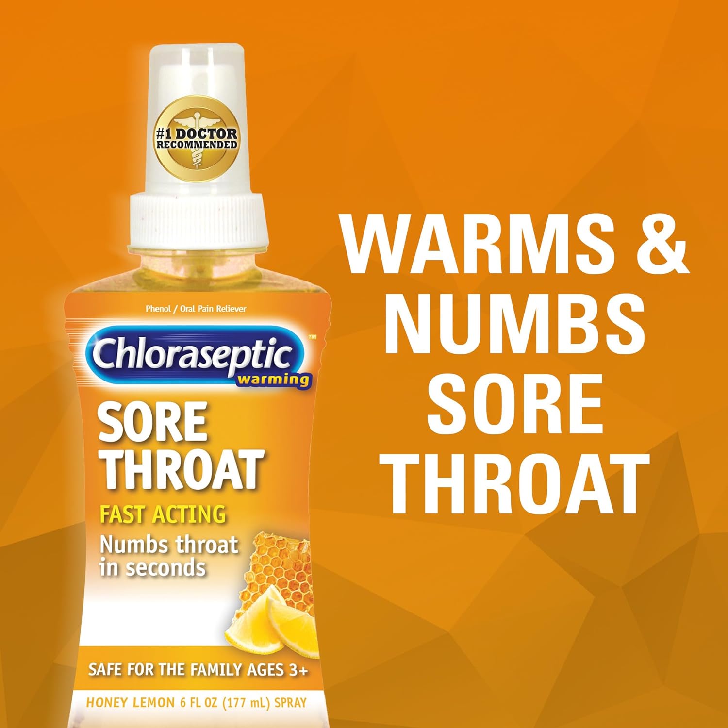 Chloraseptic Warming Sore Throat Spray to provide throat and mouth pain reliefSore throat spray numbs on contact and is targeted to reach the back of the throatFast-acting, sugar-free sore throat spray relieves pain on contact and protects the throat with a warming sensationChloraseptic Real Honey Lemon is safe for the whole family and children ages 3 and upTrusted for 50 years and the doctor recommend brand* * IQVIA Survey 2/08/22Chloraseptic is the Number One Sore Throat Relief Brand (1). With Chloraseptic Sore Throat Lozenges and Sprays, you get fast acting relief in a variety of flavors from a brand that has been relieving sore throats for over 55 years. Our fast-acting sprays and soothing lozenges relieve pain on contact and coat your throat for additional comfort. For on-the-go relief, try Chloraseptic Sore Throat Lozenges! This fast-acting sore throat remedy will be handy to keep in the medicine cabinet for fast, easy access at home or take them on-the-go for throat and mouth pain relief anytime or anywhere. Lozenges come in flavors like Wild Berries, Citrus and Warming Honey Lemon and in Sugar Free Wild Cherry and are for use with adults and children 6 years of age and over. Chloraseptic Sore Throat Sprays are aspirin free and sugar free and are for use with adults and children 3 years of age and over. (1) IRI Data Total Units Sold Ending 11/27/22, Multi-Outlet + Convenience