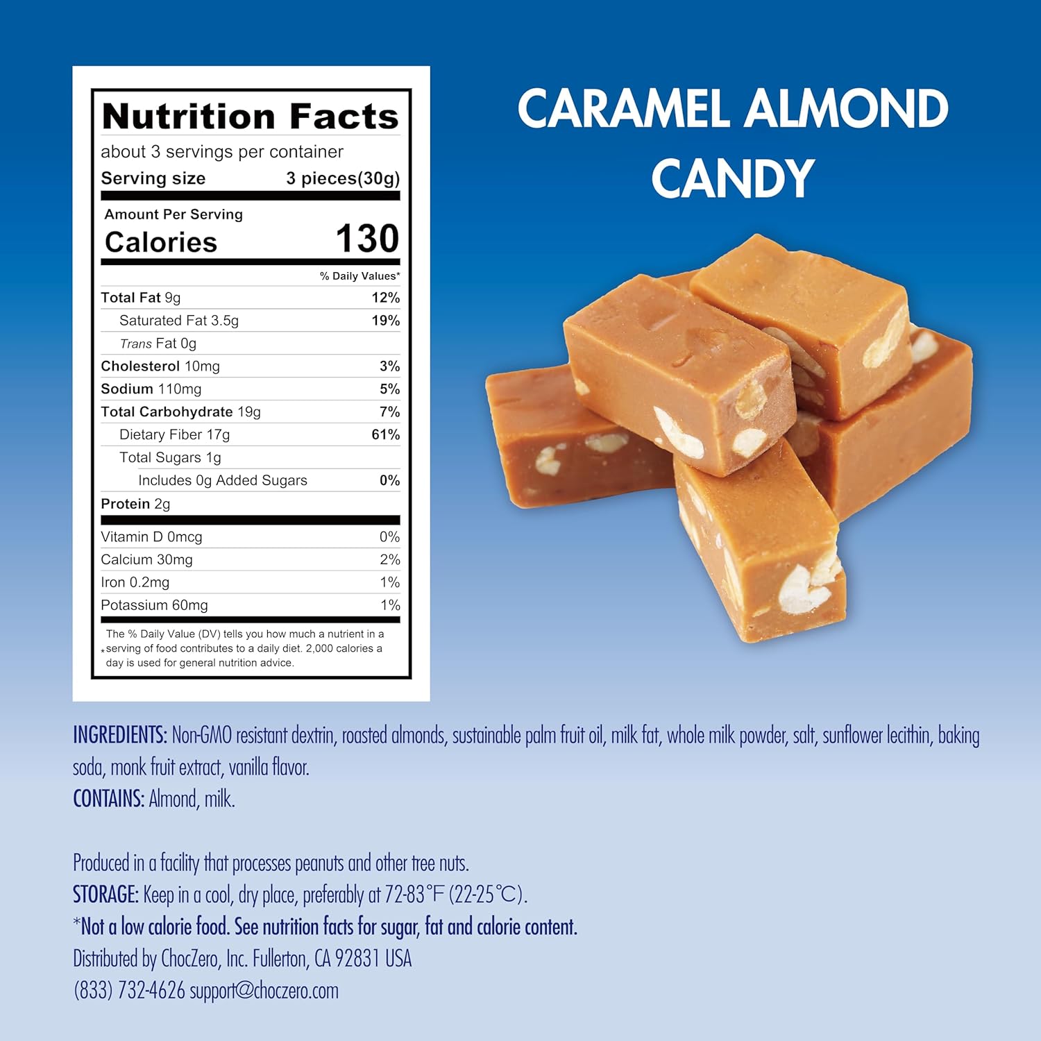 Choczero Sugar Free Almond Caramels, Soft And Chewy With Roasted Almonds, Keto Candy, All Natural, Low Carb Snack (3.5Oz Box)
