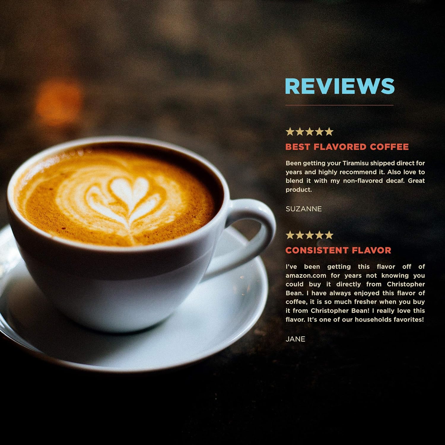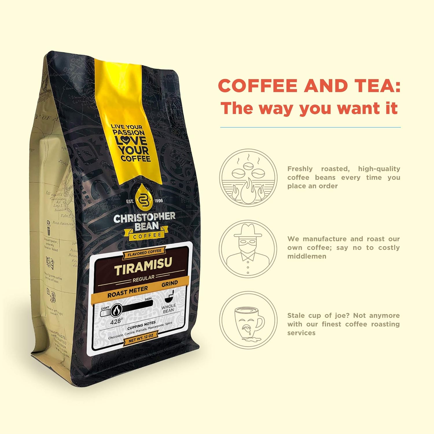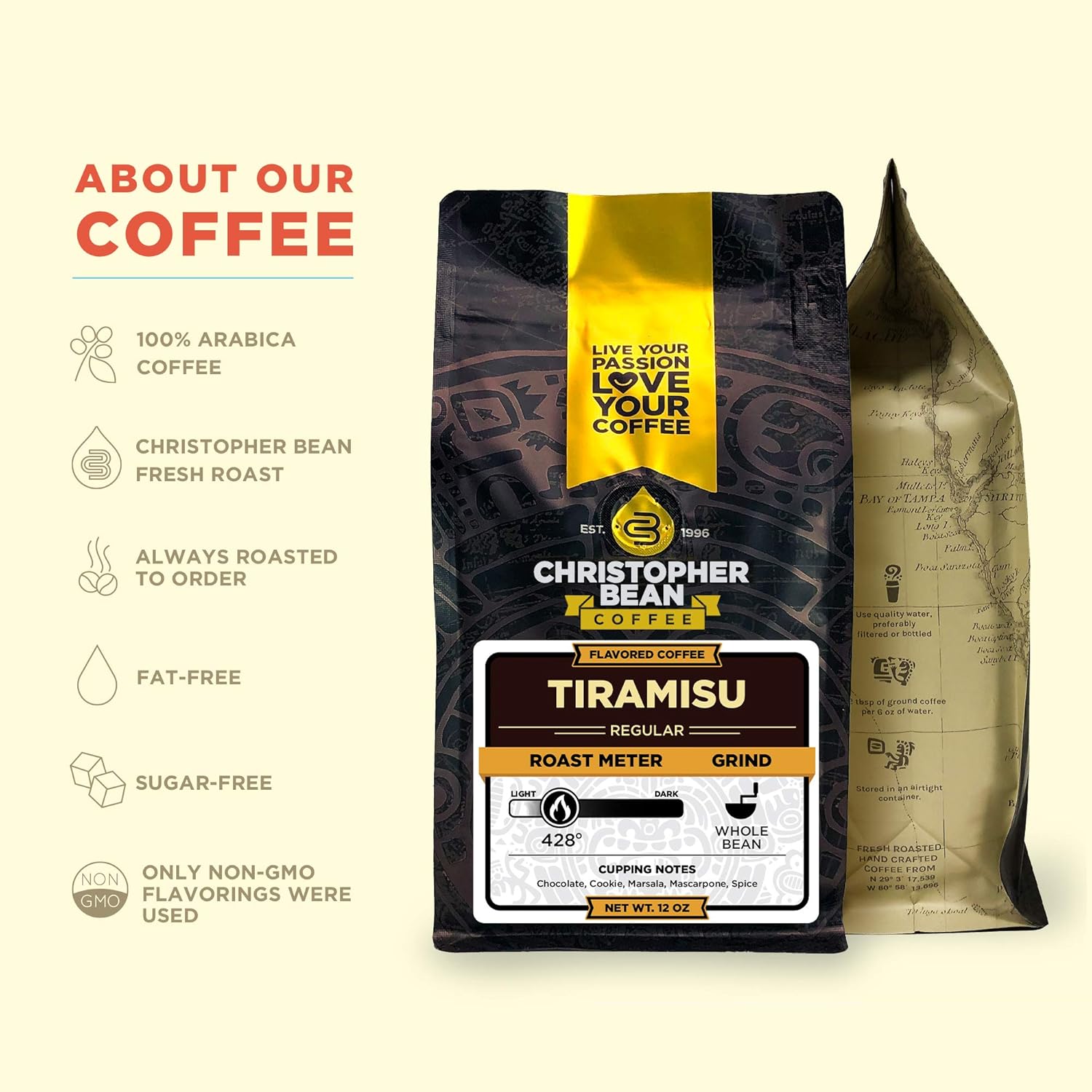 Christopher Bean Coffee - Decaf Ground Universal Drip Tiramisu Flavored Coffee With Medium Roast | Tiramisu Coffee No Sugar With 100% Arabica, No Fats, Non-Gmo | 10-Ounce