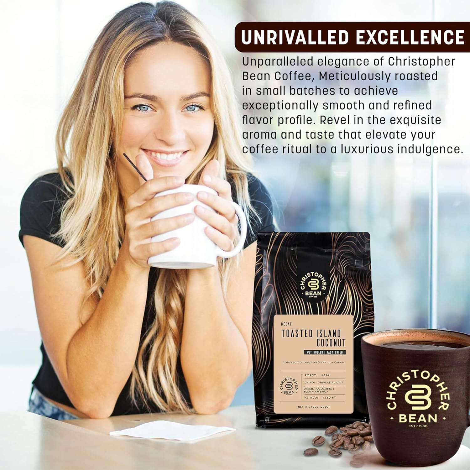 Christopher Bean Coffee - Decaf Ground Universal Drip Toasted Island Coconut Flavored Coffee| Flavored Coffee With Medium Roast 100% Arabica, No Sugar, No Fats, Non-Gmo | 10-Ounce