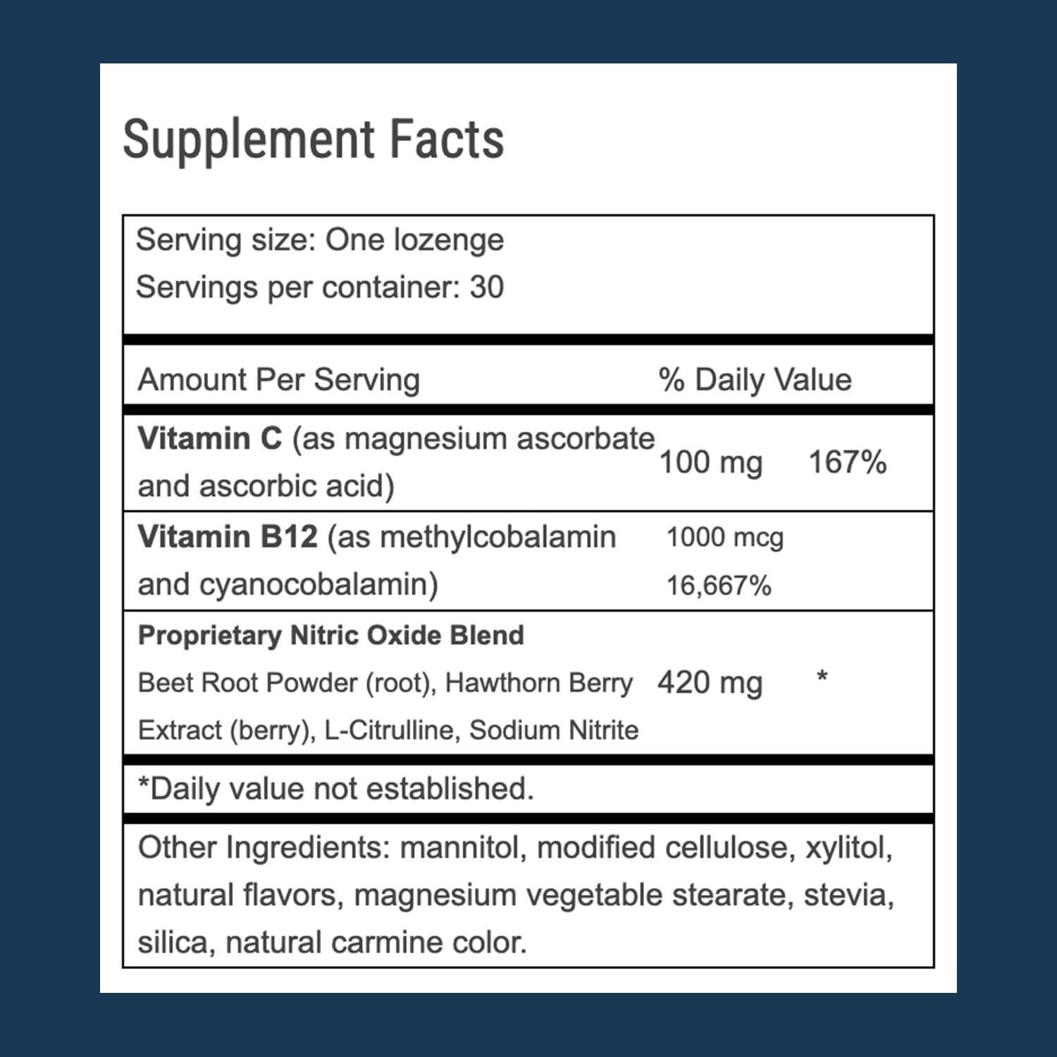 PROPRIETARY NITRIC OXIDE BLEND: The Nitric Oxide Blend includes Vitamin C, B12, Beet Root Powder (root), Hawthorn Berry Extract (berry), L-Citrulline, and Sodium Nitrite