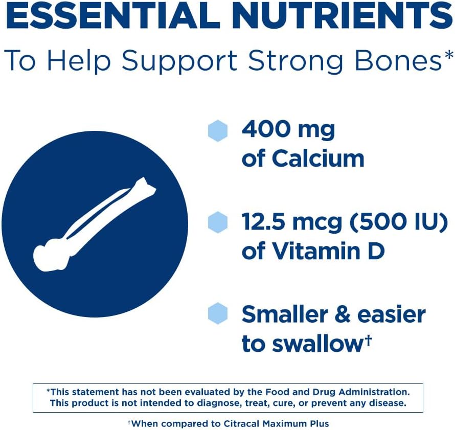 About this item DEFY BONE AGING: Citracal Petites is a sugar free calcium supplement, providing 400 mg of calcium per serving to help support bone health as part of your overall wellness and fitness regimen; just 2 caplets twice a day IMPORTANCE OF CALCIUM: This essential mineral is needed for bone health; Petites is made with Calcium Citrate WITH VITAMIN D3: 12.5 mcg ( 500 IU) per serving helps absorb dietary calcium. Suggested Age: 12 Years and Up SMALLER, EASIER TO SWALLOW: These coated caplets are smaller and easier to swallow and can be taken with or without food No.1 CALCIUM BRAND RECOMMENDED: Citracal is the no.1 Doctor and Pharmacist recommended calcium brand See more product details,DEFY BONE AGING: Citracal Petites is a sugar free calcium supplement, providing 400 mg of calcium per serving to help support bone health as part of your overall wellness and fitness regimen; just 2 caplets twice a day,IMPORTANCE OF CALCIUM: This essential mineral is needed for bone health; Petites is made with Calcium Citrate,WITH VITAMIN D3: 12.5 mcg ( 500 IU) per serving helps absorb dietary calcium. Suggested Age: 12 Years and Up,SMALLER, EASIER TO SWALLOW: These coated caplets are smaller and easier to swallow and can be taken with or without food,No.1 CALCIUM BRAND RECOMMENDED: Citracal is the no.1 Doctor and Pharmacist recommended calcium brand