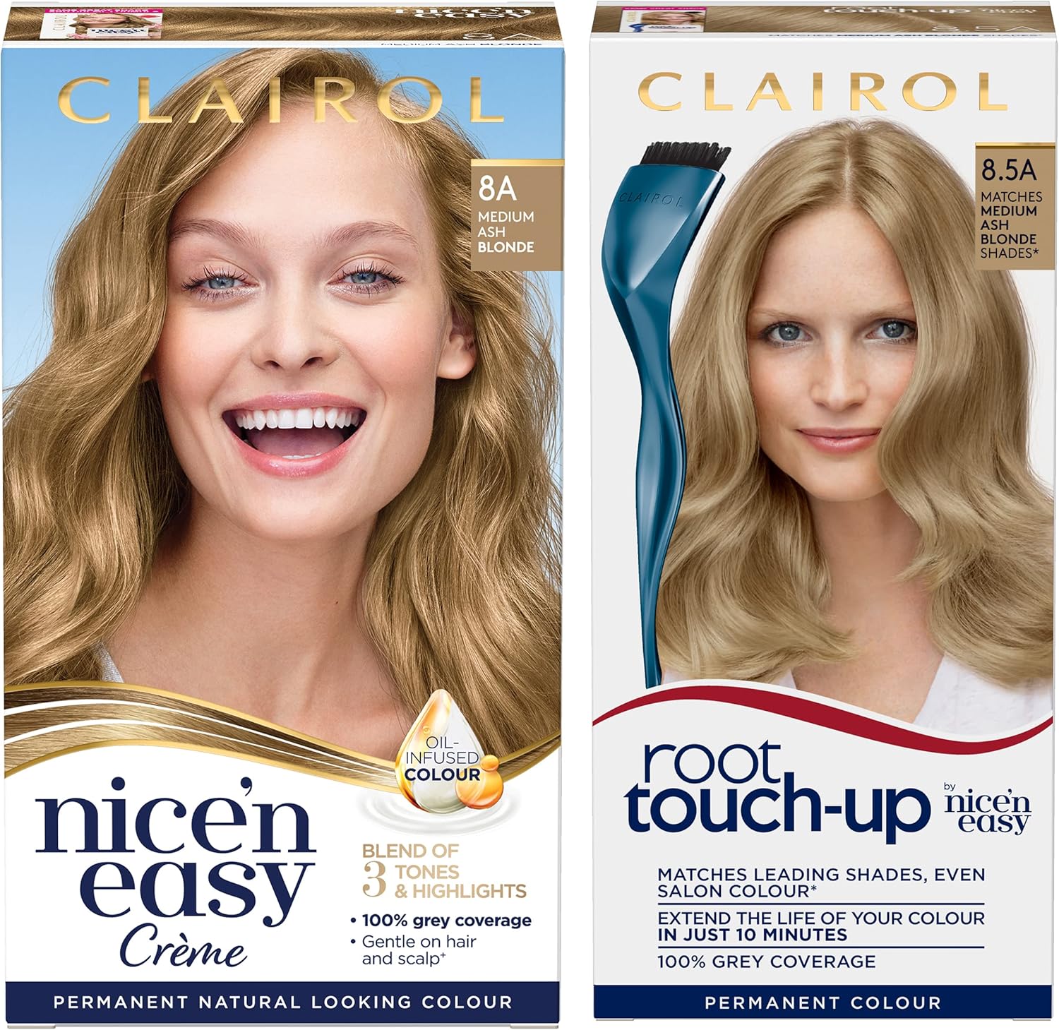 Clairol Nice' N Easy Crème, Natural Looking Oil Infused Permanent Hair Dye, 8A Medium Ash Blonde & Root Touch-Up Permanent Hair Dye, 8.5A Medium Champagne Blonde