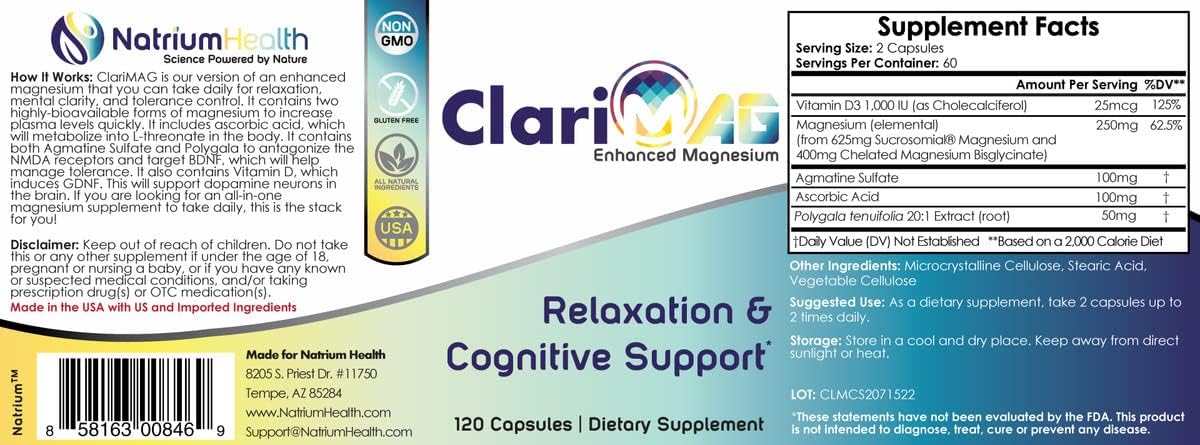 3 >Formulated to increase mental clarity, promote magnesium levels, and boost mood. Clarimag also incorporates Vitamin C, Vitamin D, Polygala Tenufolia extract, and Agmatine Sulfate. These help boost magnesium levels while promoting the same benefits
