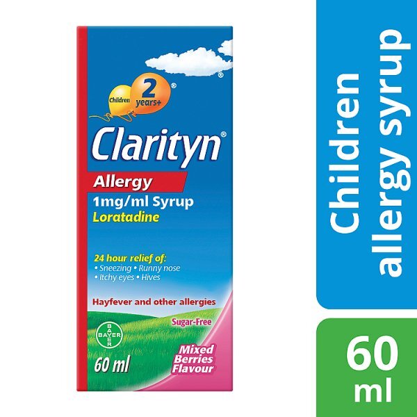 Product Information:Clarityn Syrup provides up to 24 hours of relief from hayfever and other allergies. Clatityn Syrup can relieve a variety of allergies like those caused by pets and dust, as well as hayfever and skin allergies like rashes, itching and hives. Relief from hayfever and other allergies. Each 5ml contains 5mg loratadine. Excipients with known effect: maltitol liquid, sorbitol, propylene glycol and sodium benzoate,Warning or Restrictions:Talk to your doctor, pharmacist or nurse before taking Clarityn Allergy Syrup: - if you have liver disease - if you are scheduled to have any skin tests for allergies. Do not take Clarityn Allergy Syrup for two days before having these tests. This is because it may affect test results. If any of the above apply to you (or you are not sure), talk to your doctor, pharmacist or nurse before taking Clarityn Allergy Syrup,Product Specification:Each 5ml contains 5mg Loratadine. Also contains Disodium Adetata (E386), Sodium Dihydrogen Phosphate Dihydrate (E339), Maltitol Liquid (E965), Propylene Glycol (E1820), Alycarol (E422), Phosphoric Acid (E338), Sodium Benzoate (E211), Sorbitol Liquid (E420), Sucralose (E955) Artificial Mixed Berries Flavour and Purified Water,Product Uses:For oral use. Once a day,Recyclable:Bottle, box and leaflet can all be recycled