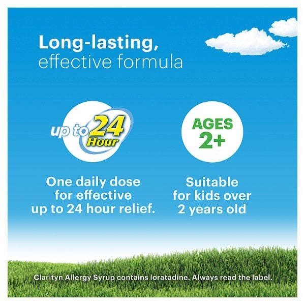 Clarityn Syrup provides up to 24 hours of relief from hayfever and other allergies. Clatityn Syrup can relieve a variety of allergies like those caused by pets and dust, as well as hayfever and skin allergies like rashes, itching and hives. Relief from hayfever and other allergies. Each 5ml contains 5mg loratadine. Excipients with known effect: maltitol liquid, sorbitol, propylene glycol and sodium benzoate