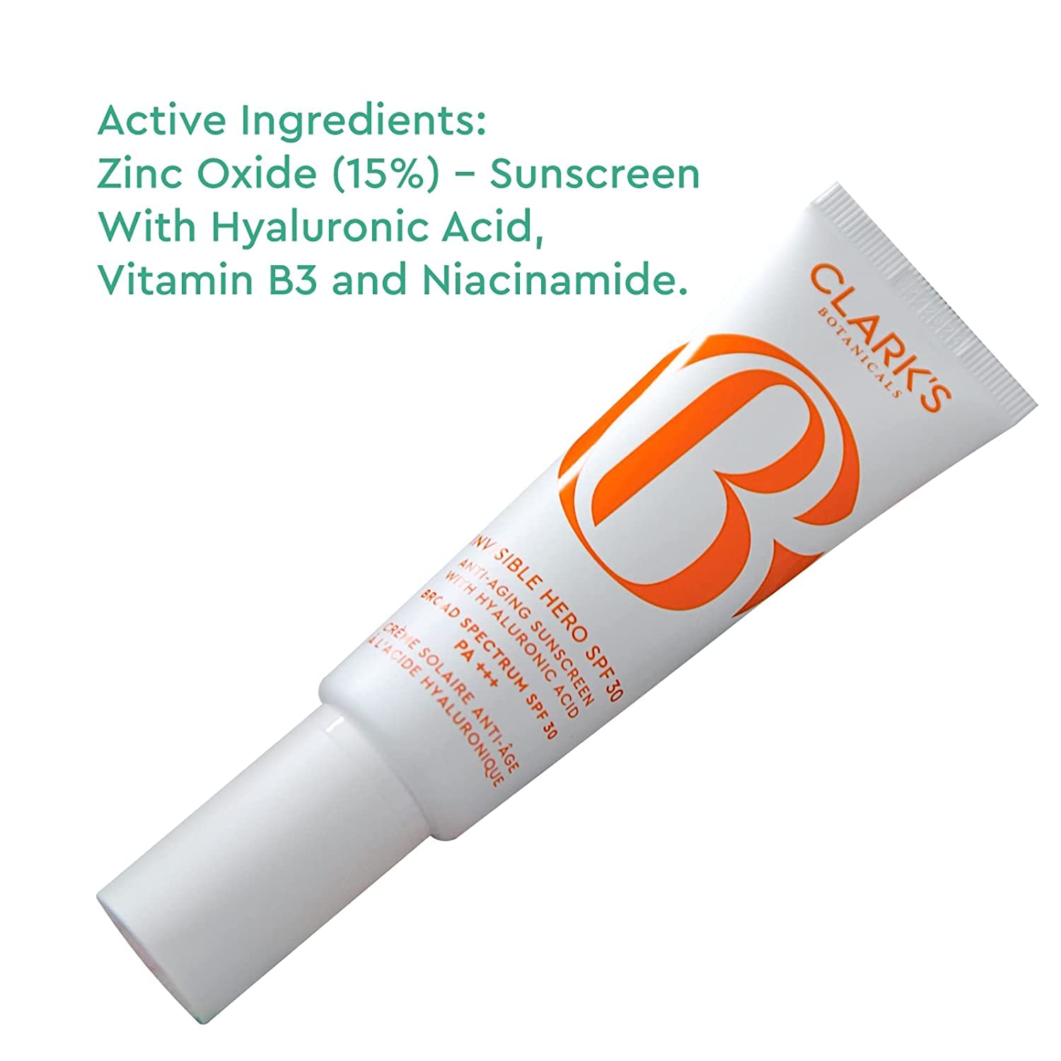 ABOUT THE PRODUCT: 1 > ULTIMATE SUN PROTECTION: Shield your skin from the sun and harmful environmental factors. Our clean, mineral-based sunscreen doubles as a primer, providing ultimate sun protection that absorbs quickly and leaves a poreless finish 2 > ANTI-AGING INGREDIENTS: Infused with hyaluronic acid, micronized red algae, and niacinamide, our sunscreen reduces the appearance of fine lines and wrinkles while hydrating and improving skin texture 3 > BLUE LIGHT PROTECTION: Our sunscreen fights against blue light and environmental pollution, making it perfect for those who spend long hours in front of screens. Sunflower extract helps fight against blue light and environmental pollution, providing extra protection for your skinClarks Botanicals Invisible Hero SPF 30: The Ultimate Skin Perfector for All Skin Types, with Hyaluronic Acid, Vitamin B3, Anti-Aging Ingredients, and Blue Light Protection (100 ml | 3.4 fl oz)